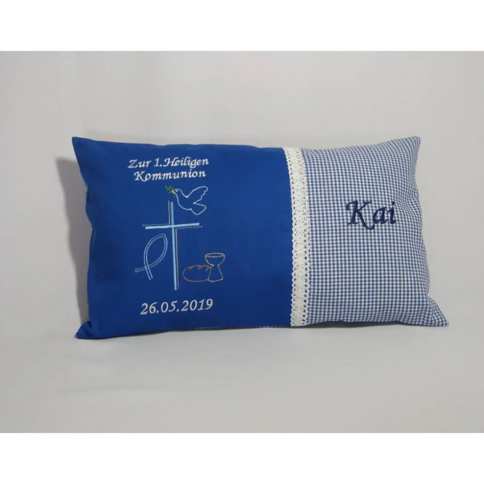 Ein Kissen aus Baumwolle mit Namen und Datum.Die Kissenfüllung ist aus Polyester.