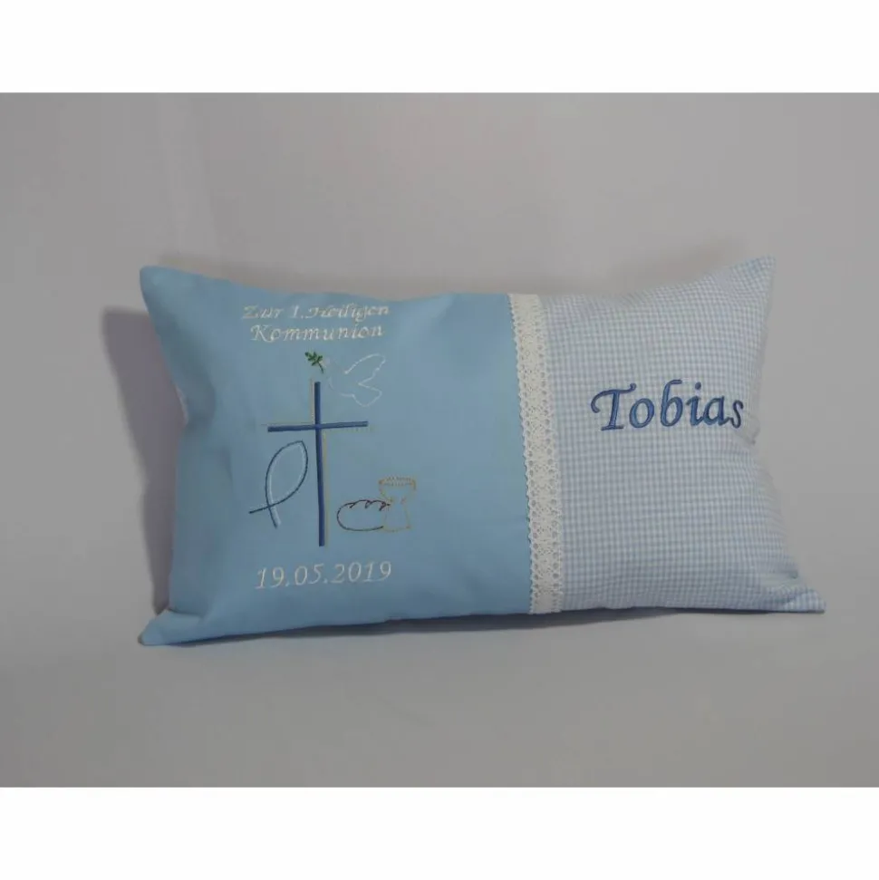 Ein Kissen aus Baumwolle mit Namen und Datum.Die Kissenfüllung ist aus Polyester.