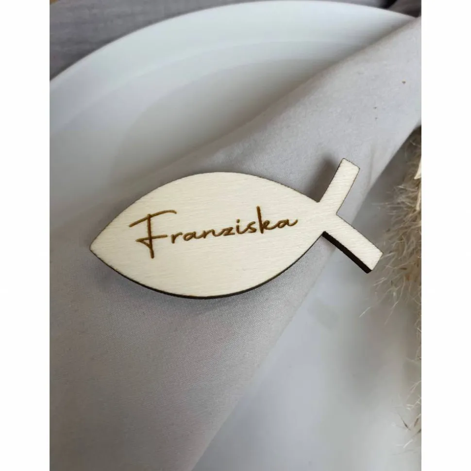 Namensschilder Fische Taufe, Kommunion, Konfirmation / Tischdekoration Tischkarten personalisiert mit Namen aus Holz