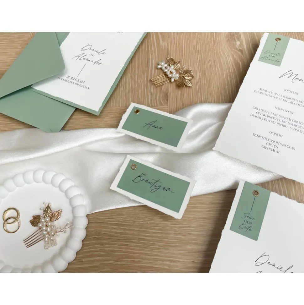 Diese Namenskarten sind aus hochwertigem Strukturpapier mit handgerissenen Kanten und einem Farbpapier mit den jeweiligen Namen. Gesamtmaße ca. 5 x 9 cm.