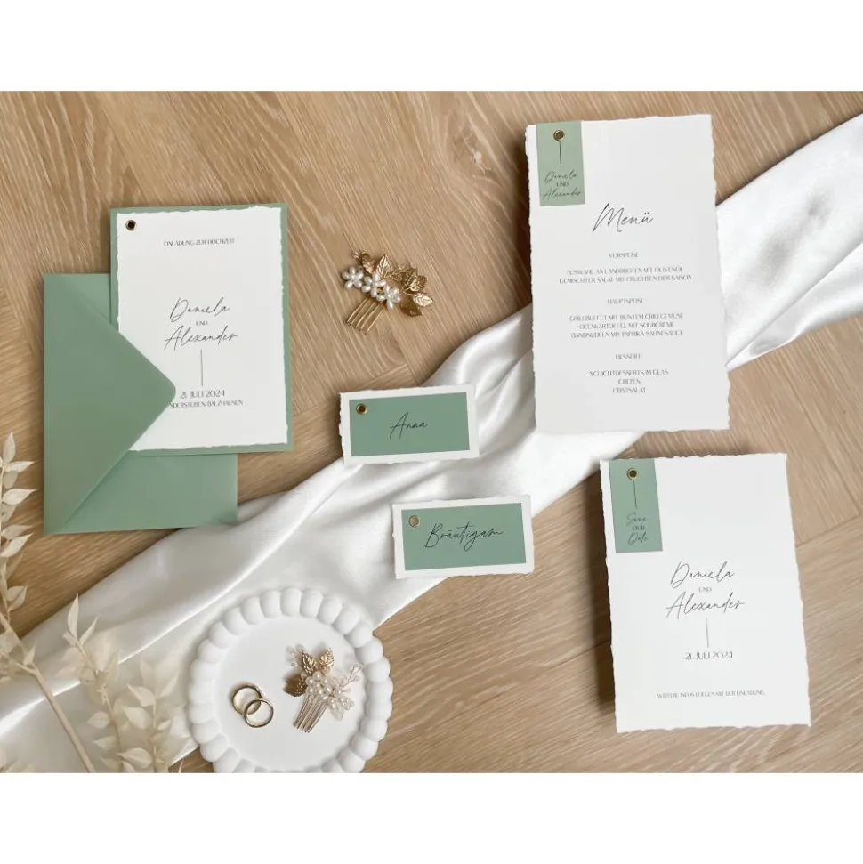 In meinem Shop findet ihr ebenso die passenden Save the Date Karten, Einladungskarten sowie Menükarten in diesem Design.