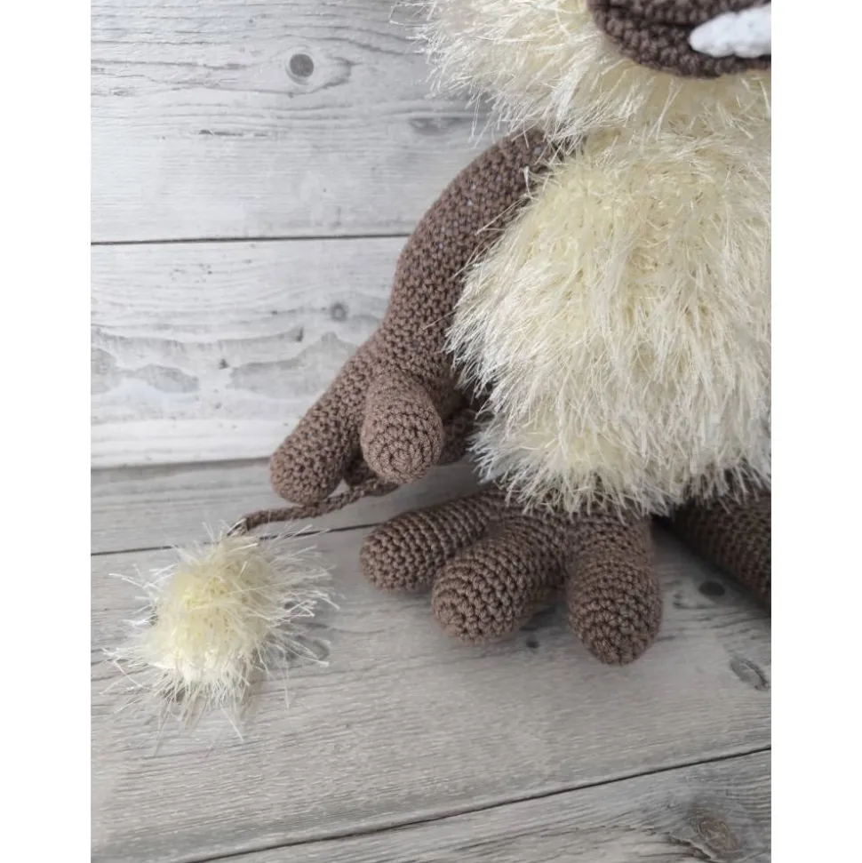 Dieser handgemachte Hausgeist ist etwa 35 cm groß und sieht einfach zum Verlieben aus! Sein Körper ist aus flauschiger Effektwolle ( Fransenwolle) gehäkelt, was ihm ein besonders wuscheliges Aussehen verleiht.