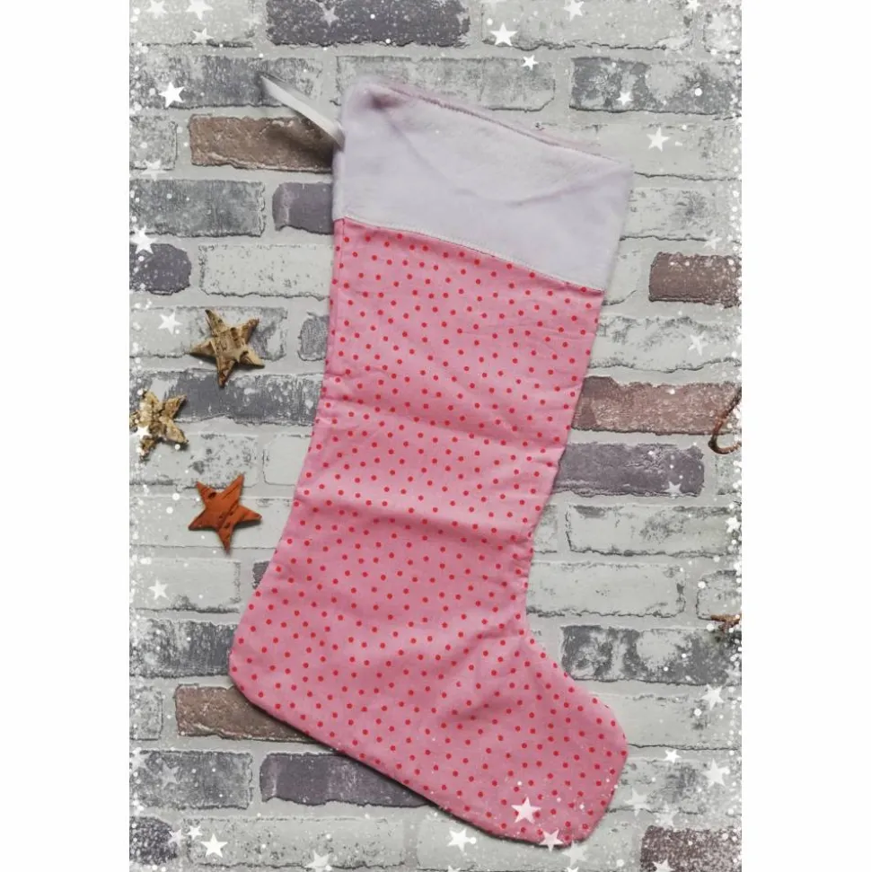 Der Stiefel ist etwa 36 cm hoch. Aus rosa-gepunktetem Stoff, oben ein weißer flauschiger Stoff. Für den Innenstiefel habe ich einen Baumwollstoff verwendet.