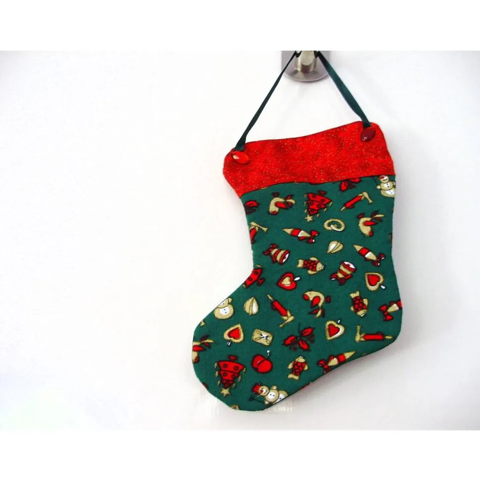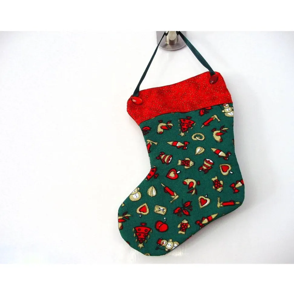 Der genähte Dekohänger ist aus einem tannengrünen Baumwollstoff mit weihnachtlichen Motiven. Der Stiefelschaft ist aus einem roten Baumwollstoff mit kleinen, goldenen Punkten abgesetzt.