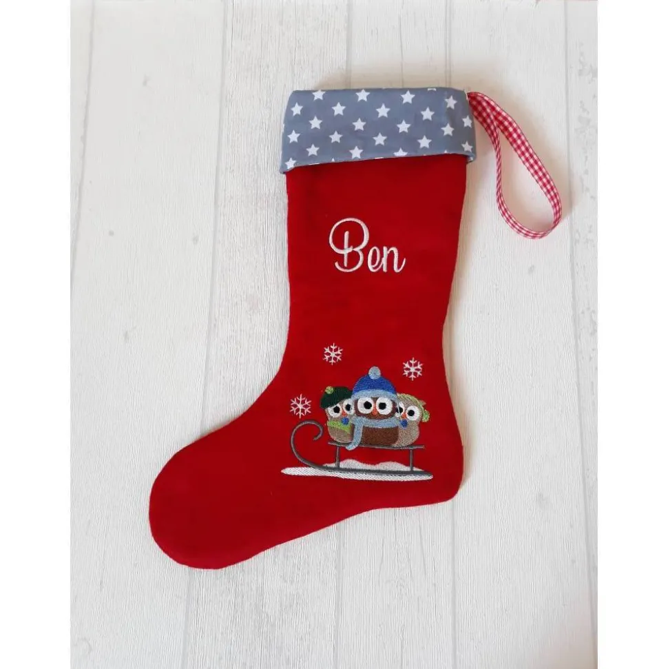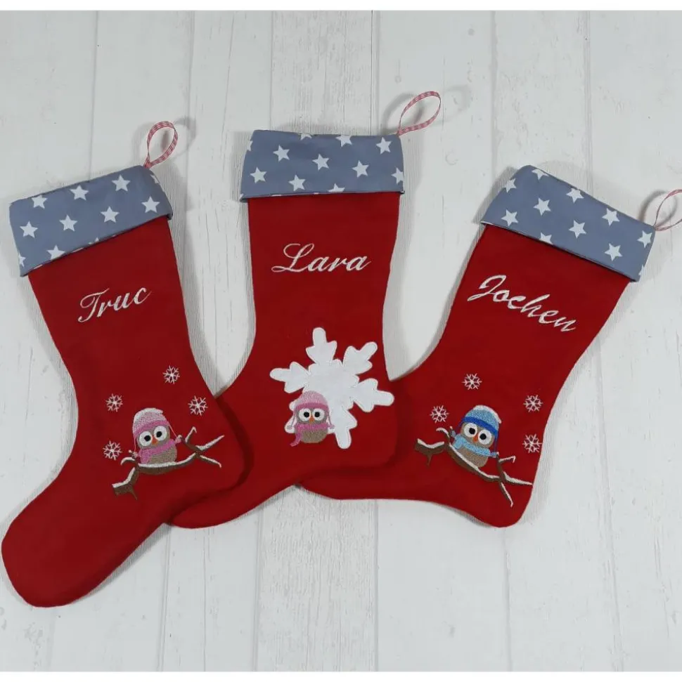 Ich sticke Deinen Wunschnamen auf den Schaft des Strumpfes, in die „Hacke“ sticke ich Eulchen. Ich habe einige Schneeeulen zur Auswahl, sprich mich gern auf weitere Motive an!