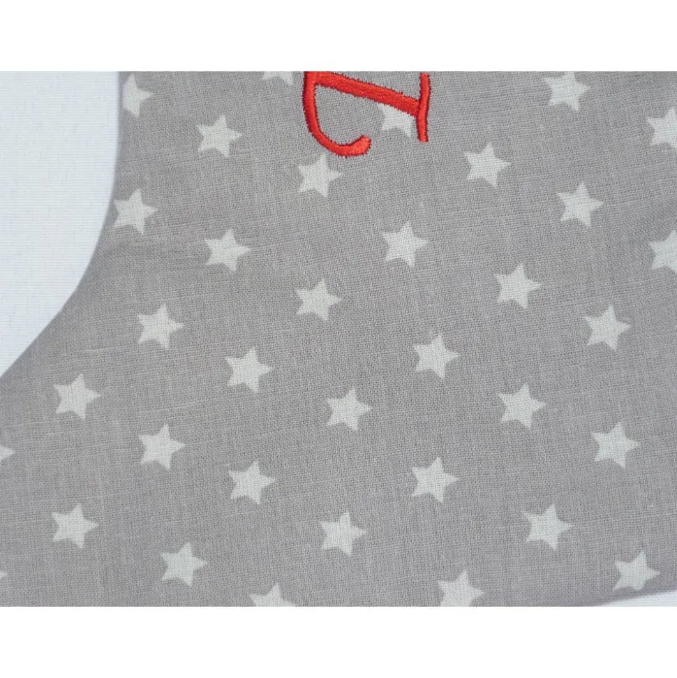 Zum befüllen oder einfach als Deko.Er ist aus grauer Baumwolle mit weißen Sternen. Das rote Baumwollfutter mit den goldenen Tupfen macht ihn so richtig festlich. Er ist ganz auf Volumenvlies gearbeitet, daher schön griffig und nicht so platt.Auch gut geeignet als kleines Mitbringsel. Durch den aufgestickten Namen ist er was ganz persönliches. Größe ca:33 cm hoch Breite oben ca:15 cm .