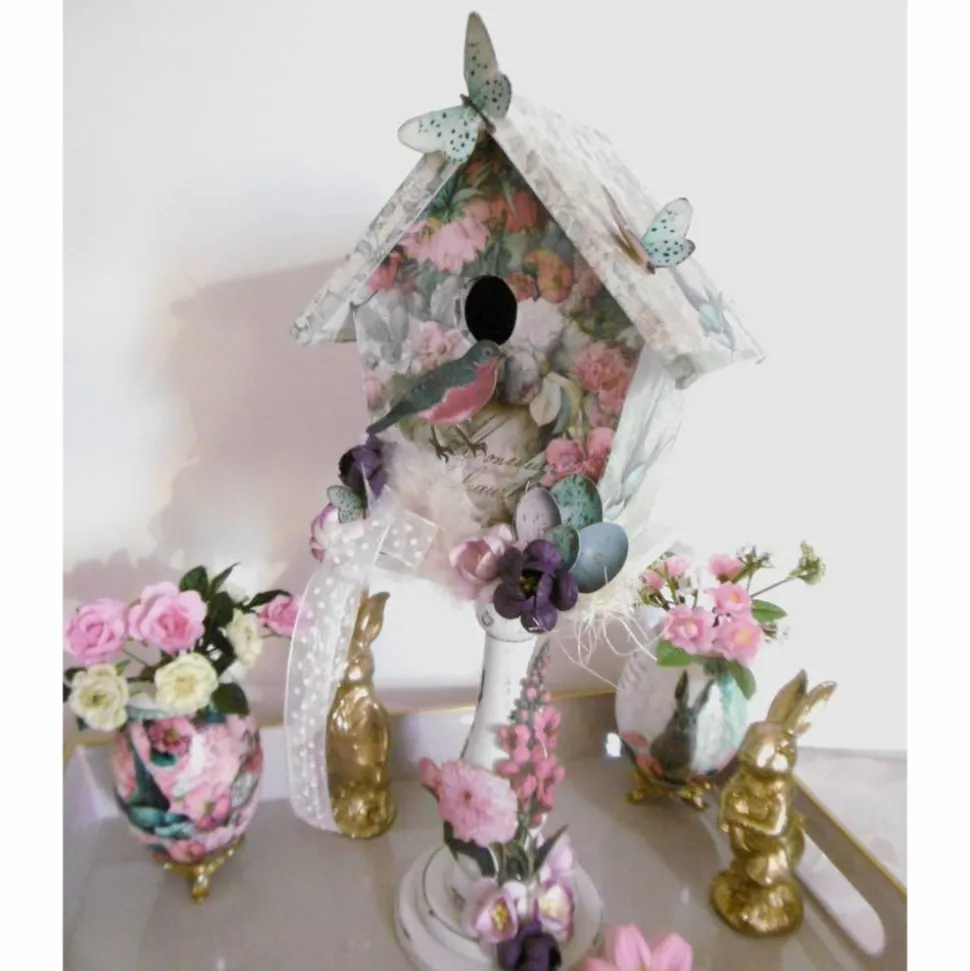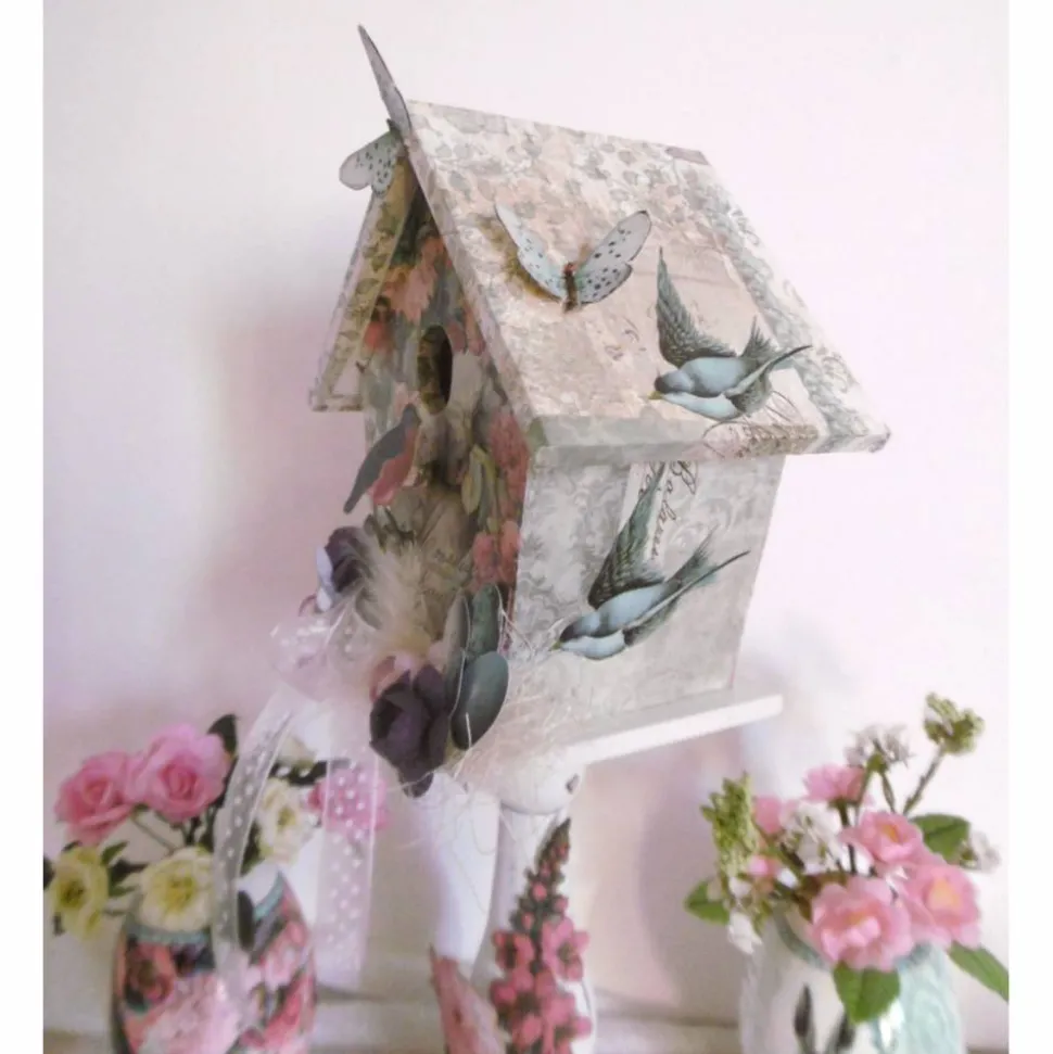 Wir haben ein Deko-Vogelhaus aus Holz mit edlem bunten Designpapier beklebt und mit weiteren Dekoelementen wie kleinen Blumen, Laser-Cuts aus edlen Designpapieren , Organzaband, Sisal , kleinen Schmetterlingen etc. dekoriert.