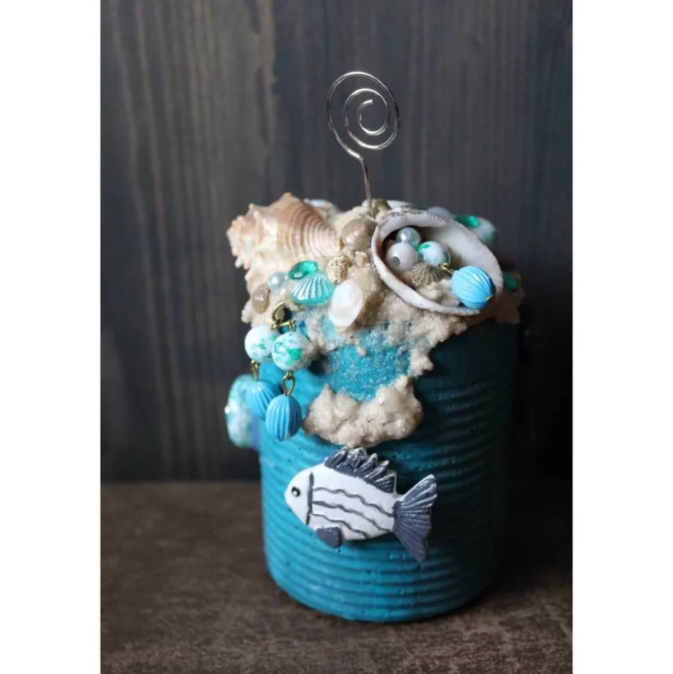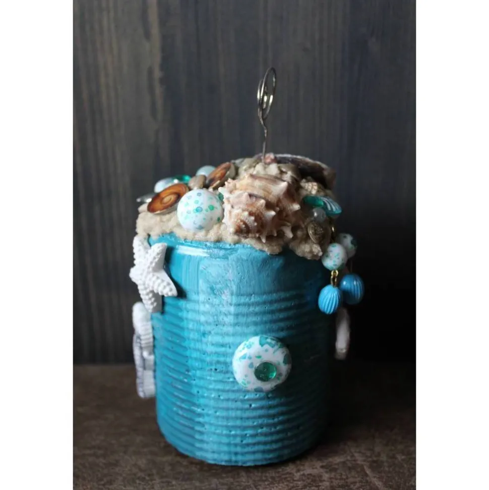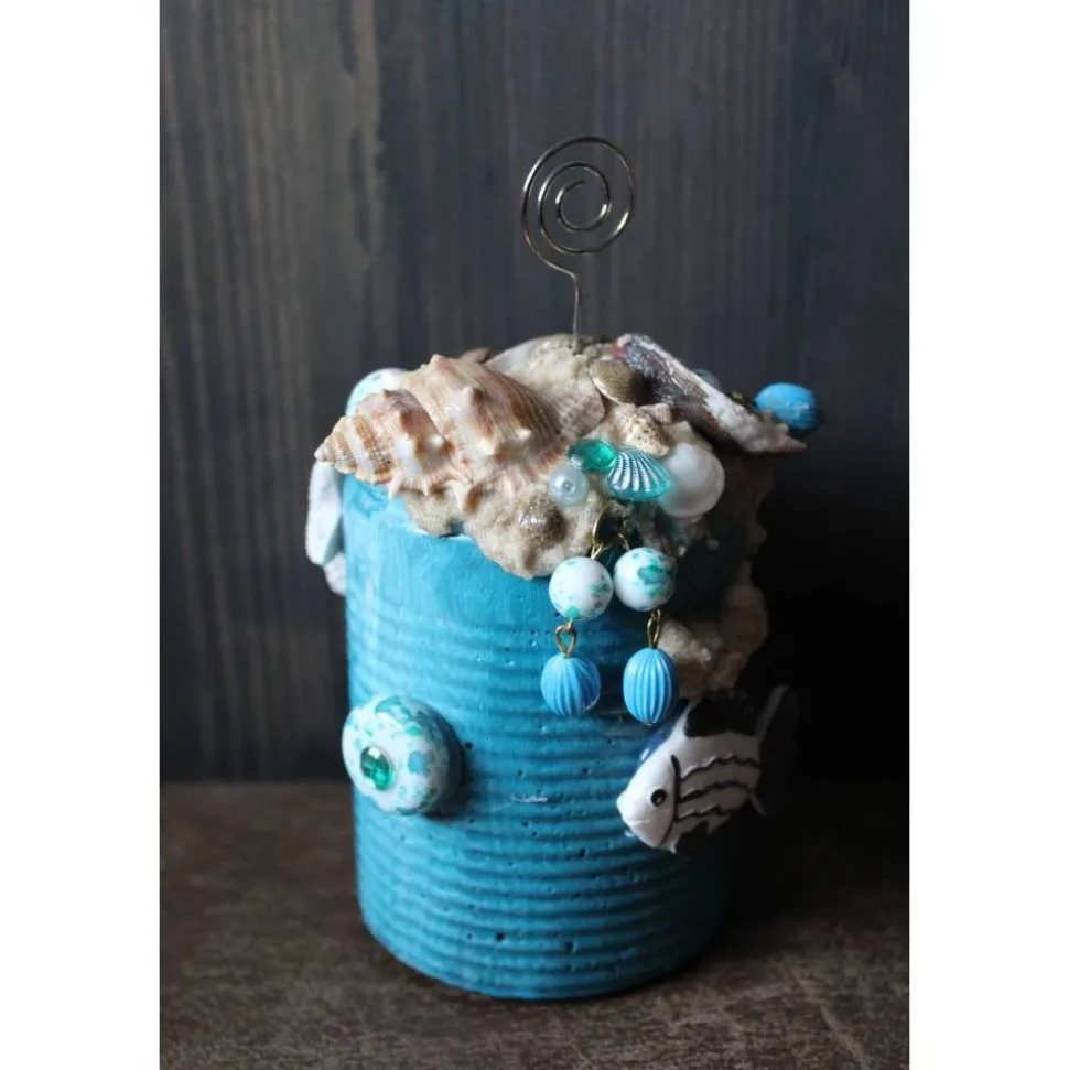 Ein aus Beton gegossenes Objekt in Form einer Konservendose. Künstlerisch gestaltet mit Acrylfarben im Shabby-Stil, in Türkist und Blau. Verziert mit Schmucksteinen, Kunststoffperlen, Muscheln, Meerestieren aus Polyresin, sowie Modeliermasse. Tolle Shabby-Effekte durch Lufteinschlüsse im Beton.
