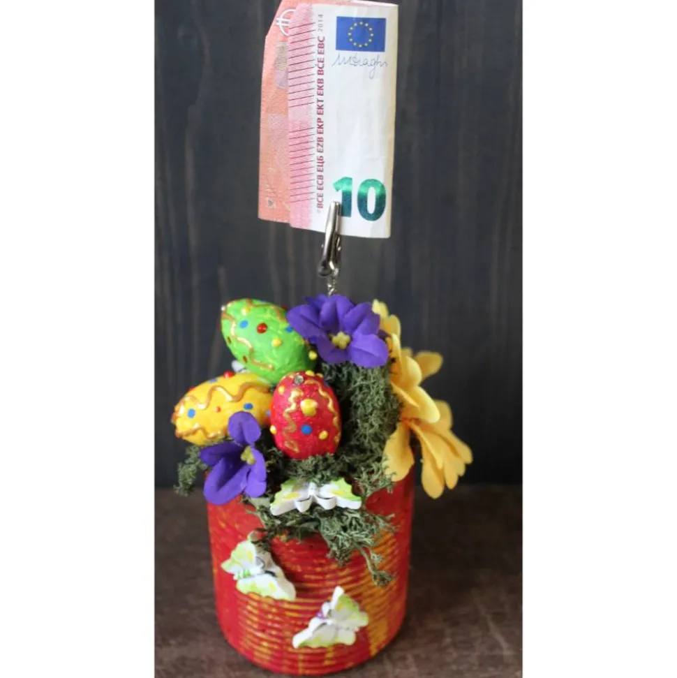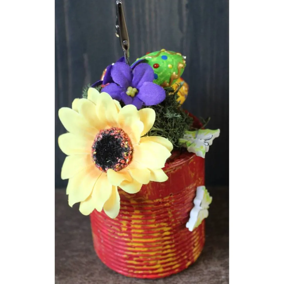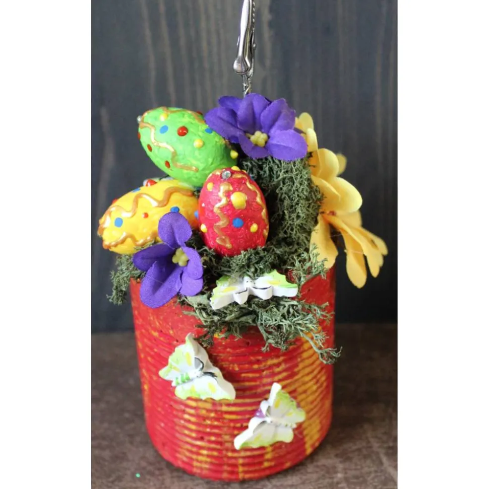 Ein aus Beton gegossenes Objekt in Form einer Konservendose. Künstlerisch gestaltet mit Acrylfarben im Shabby-Stil, in Rot, und Gelb. Bunt verziert mit Eiern, Kunstblumen und Islandmoos, sowie Schmetterlingen aus Polyresin. Tolle Shabby-Effekte durch Lufteinschlüsse im Beton.