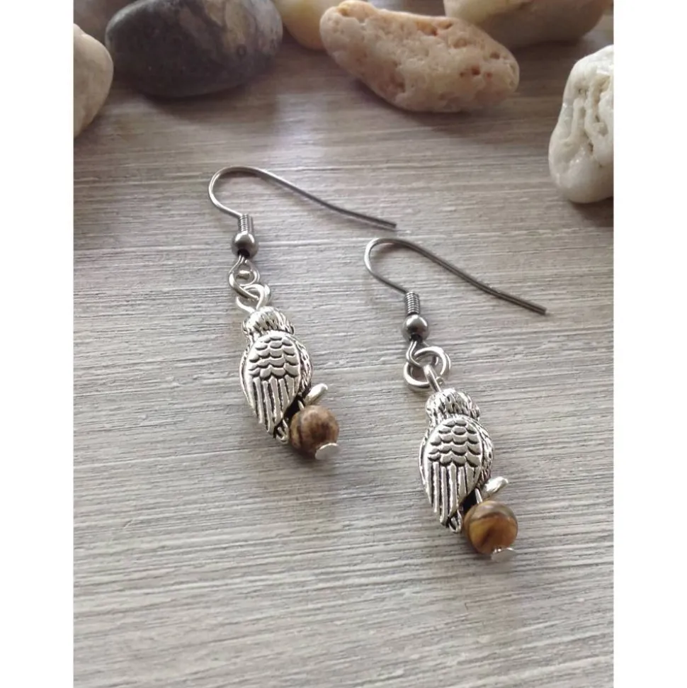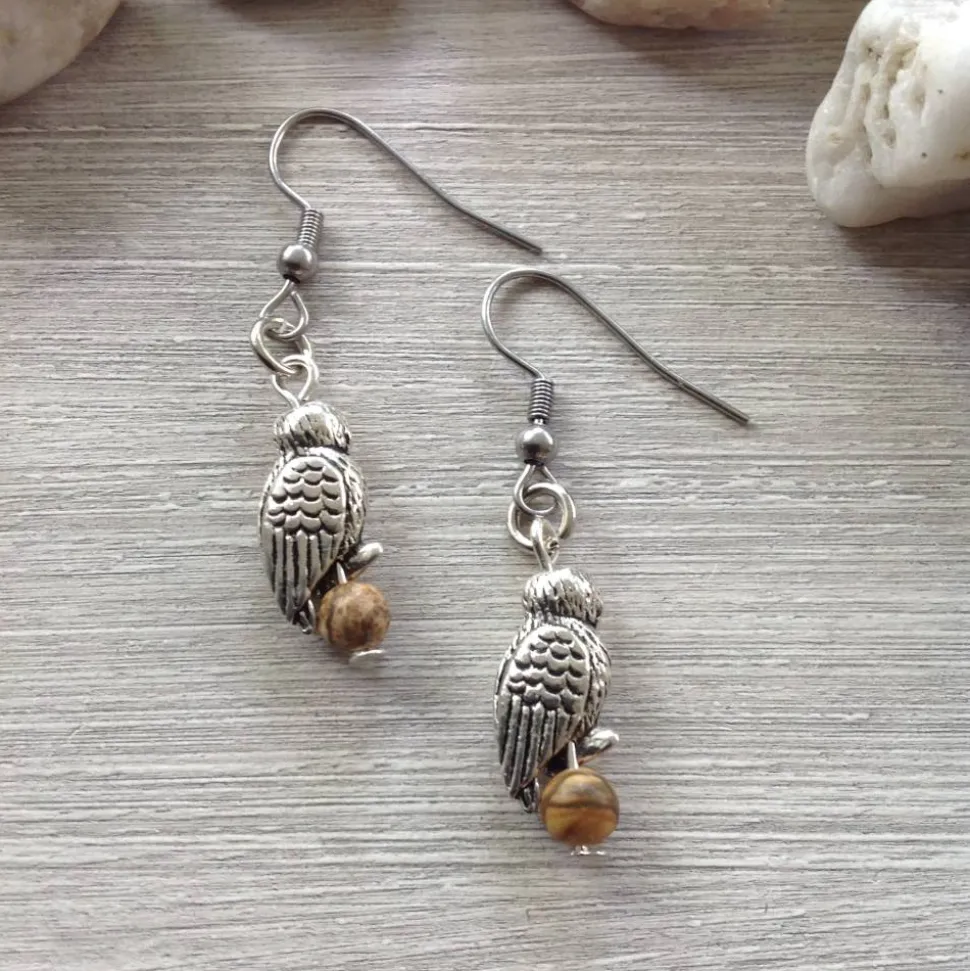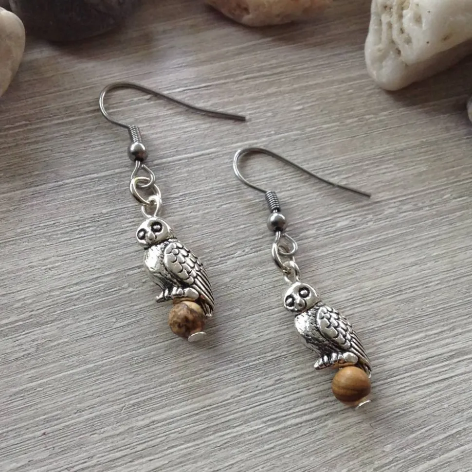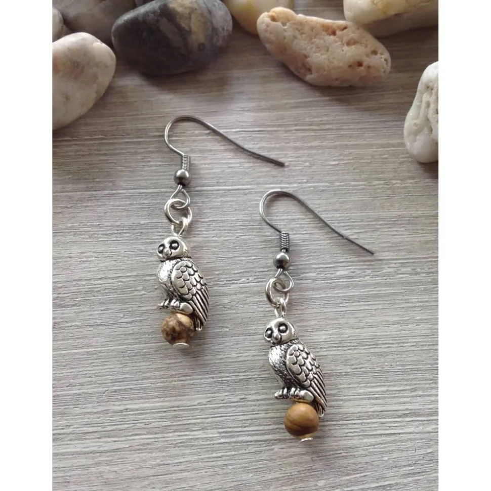 Die Eulen ’sitzen‘ auf Landschaftsjaspisperlen. Jaspis ist ein Naturprodukt, daher unterscheiden sich die Perlen leicht in Maserung, Struktur und Farbgebung ( kann also von der Abbildung leicht abweichen ). Die Eulen sind etwa 1,3 cm hoch. Die Perle hat einen Durchmesser von 4 mm. Die Eulen sind mit einer Metallöse an dem Ohrhaken aus Edelstahl befestigt. Die Gesamtlänge beträgt ca 4,3 cm.