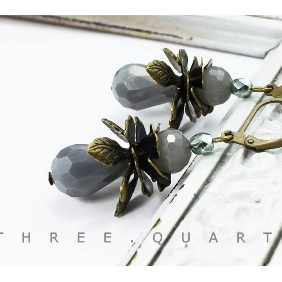 Ohrringe mit Tropfen Perlen in grau, dunkelgrau. Mit Metall Blumen in bronze und kleinen Perlen in türkis, eisblau.