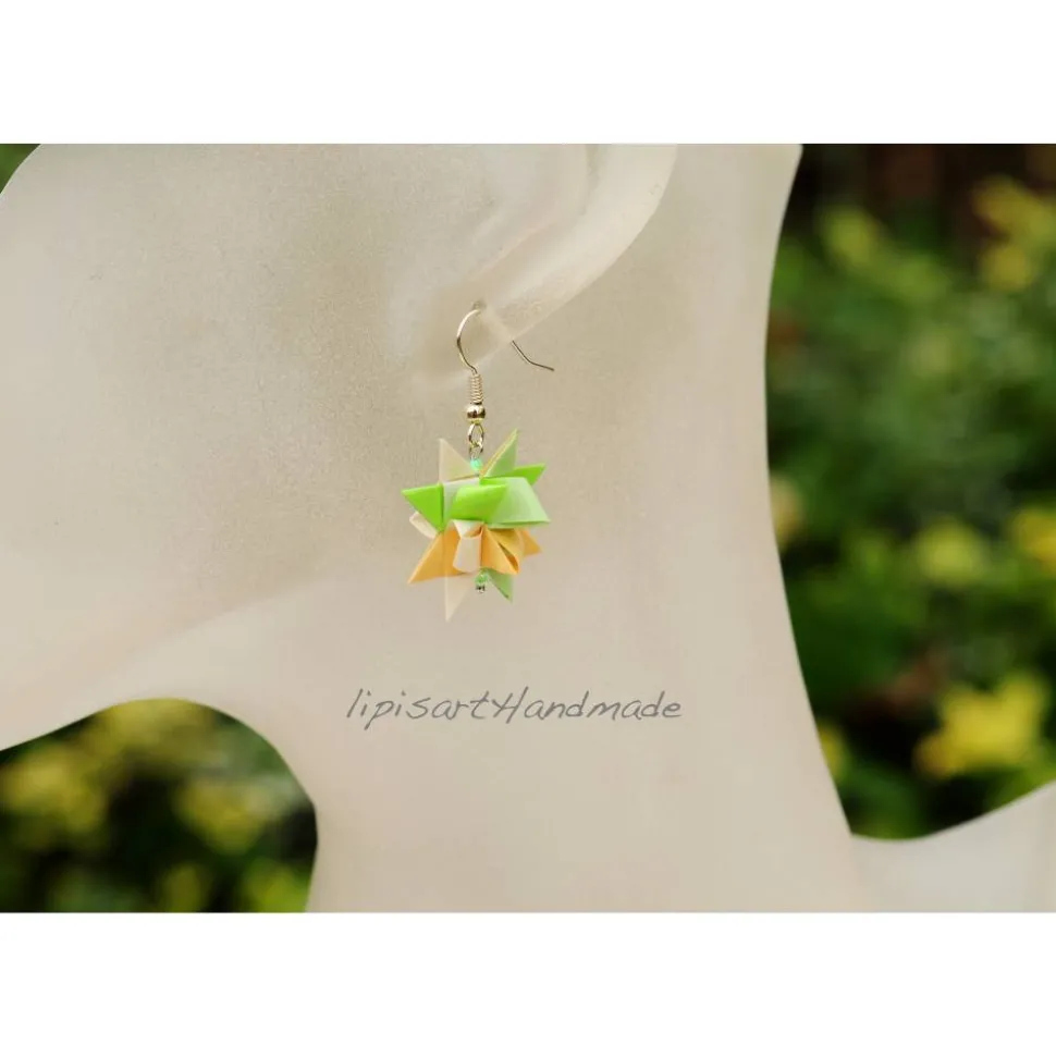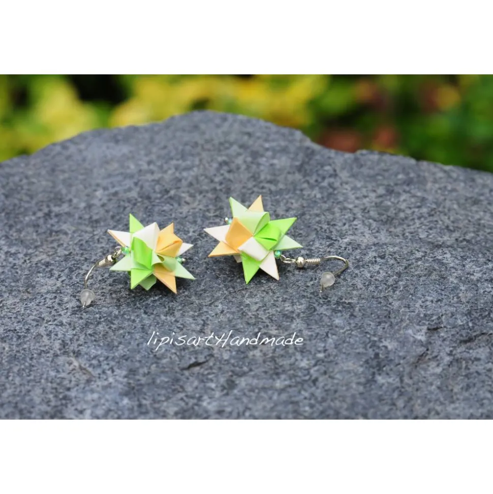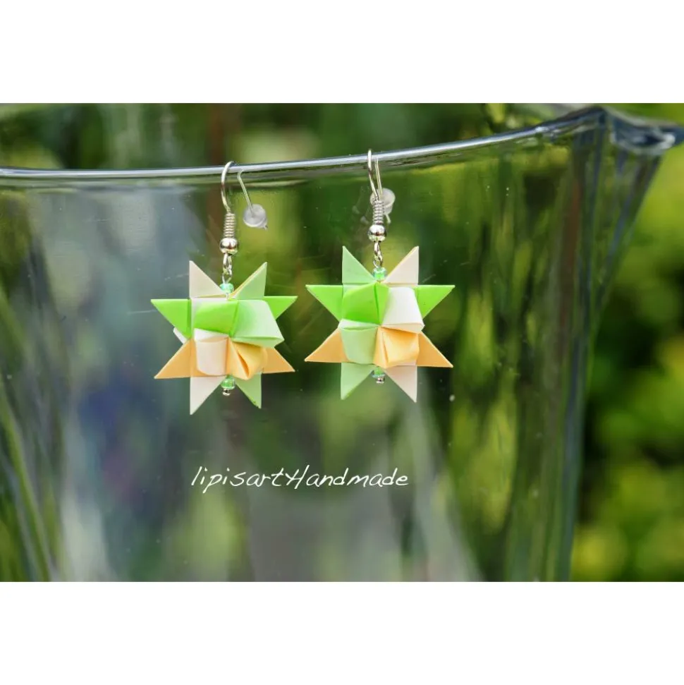 Fröhliche klassische grüne Papier-Sterne in Pastell. Da muss man doch nicht auf Weihnachten warten 🙂 Kann man aber auch an Weihnachten tragen.