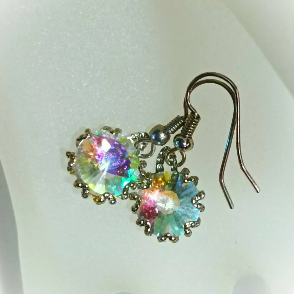 Mit den irisisierenden Kristallen sind die Ohrringe leicht und unkompliziert zu tragen und zu allen Farben zu kombinieren. Trag sie im Ibiza Stil zum Maxikleid und zur Tunika oder ganz sophisticated zum dunklen Business outfit. Auch zum Dirndl sind diese Ohrringe als farbenfroher Trachtenschmuck voller Lebensfreude ein wertiger Blickfang. Dieser Ohrschmuck wird sicher bald zu deinem Lieblingsschmuck..