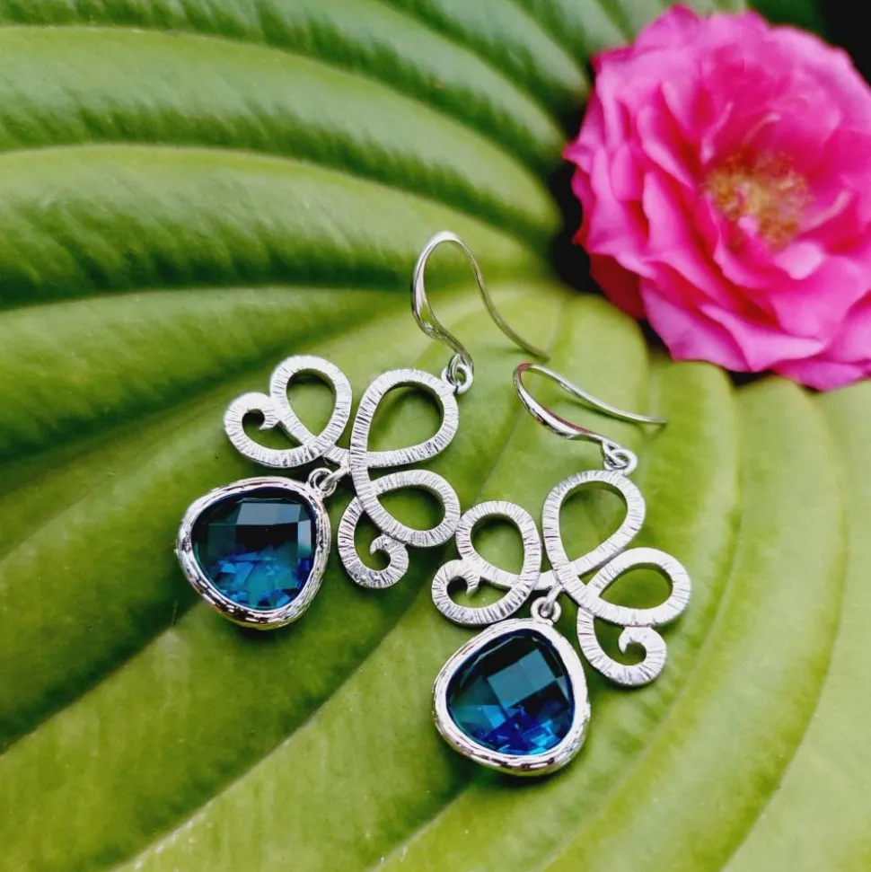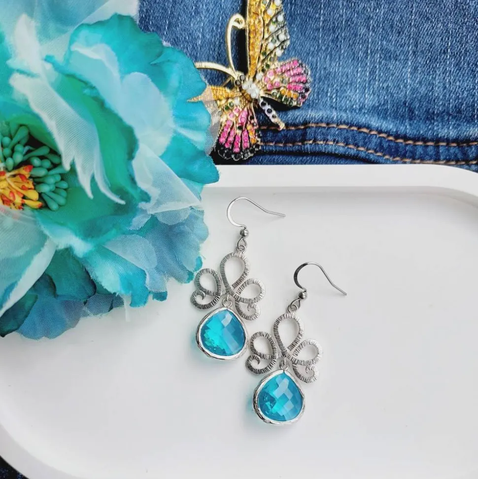 Größe: Ohrhaken ca. 14 x 20 mm, Größe der Ornamente: ca. 21 x 21 mm, blaue, türkise, lavendelrosafarbene Glastropfen ca. 13 x 15 mm