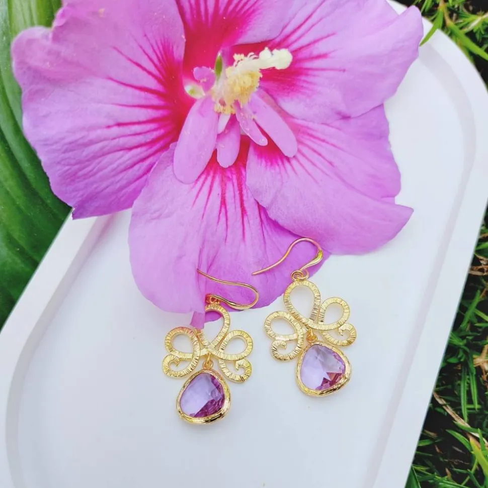 Material: Messing rhodiniert/vergoldet, Edelstahl (Ohrhaken), Messing matt rhodiniert/vergoldet (Ornamente), Glas Messing rhodiniert/vergoldet (Glastropfen)
