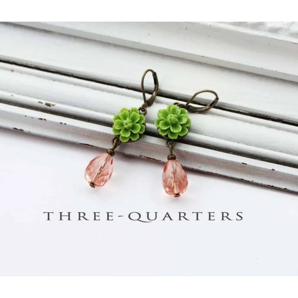 Schöne Ohrringe im shabby, vintage Stil. Perlen in Tropfenform, rosa. Blume in grün.