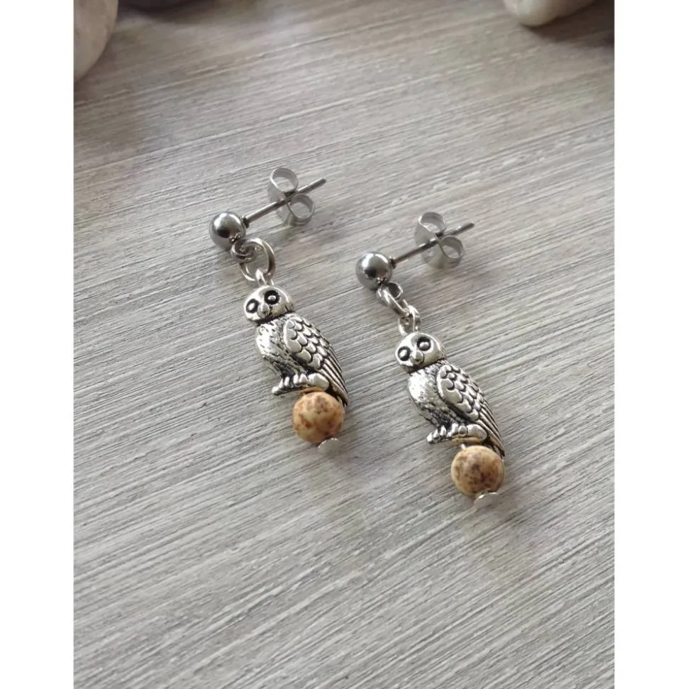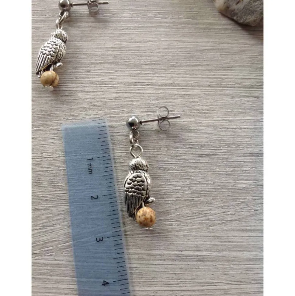 Die Eulen ’sitzen‘ auf Landschaftsjaspisperlen. Jaspis ist ein Naturprodukt, daher unterscheiden sich die Perlen leicht in Maserung, Struktur und Farbgebung ( kann also von der Abbildung leicht abweichen ). Die Eulen sind etwa 1,3 cm hoch. Die Perle hat einen Durchmesser von 4 mm. Die Eulen sind mit einer Metallöse an den Ohrsteckern aus Edelstahl befestigt. Die Gesamtlänge beträgt ca 4,3 cm.