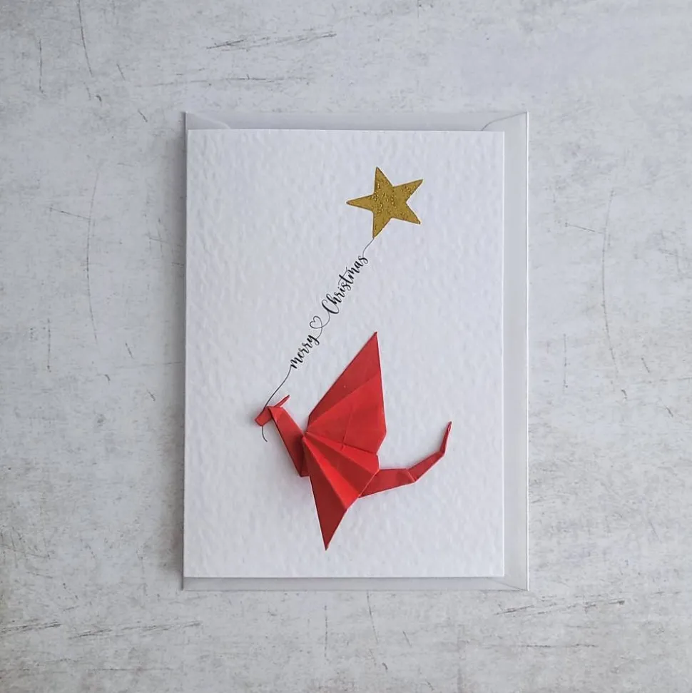 Handgemachte Weihnachtskarte Origami Drache mit Schriftzug „Frohe Weihnachten“