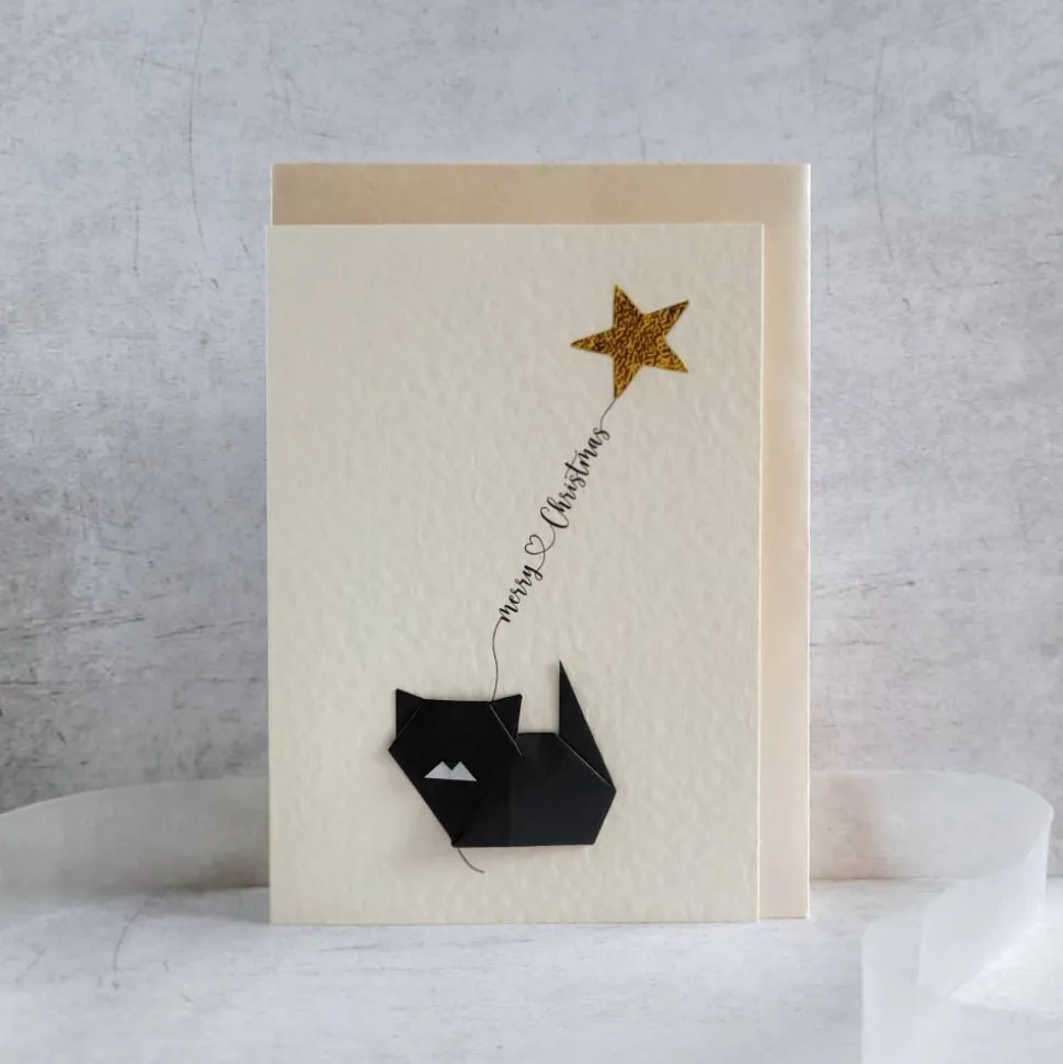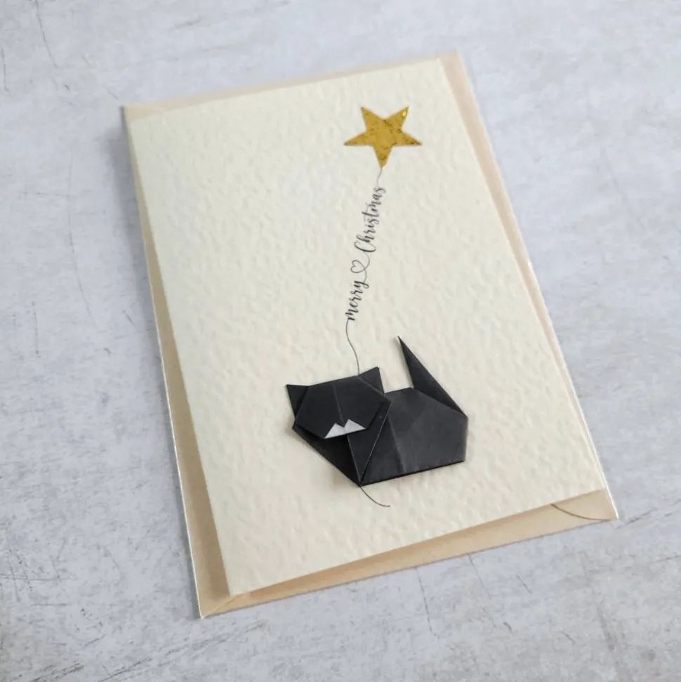 Handgemachte Origami Weihnachtskarte Katze mit Schriftzug „Merry Christmas“ – ideal für Katzenfreunde, Tierliebhaber oder einfach als liebevolle Grußkarte zu Weihnachten.