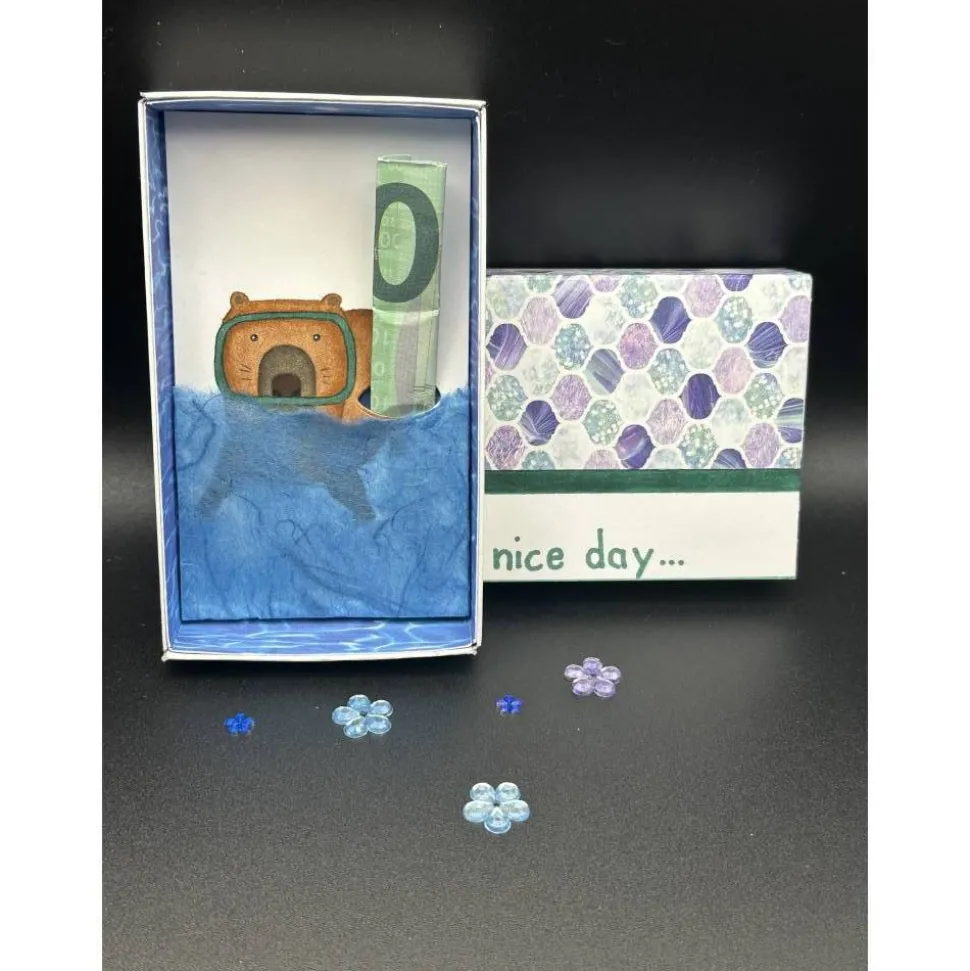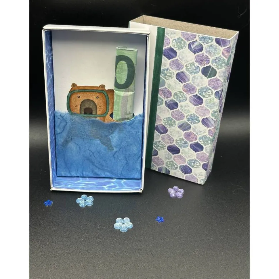 Verpacke dein Geldgeschenk oder deinen Gutschein auf besondere Weise! Mit dieser handgemalten Capybara Box, die mit einer türkisfarbenen Taucherbrille fröhlich im Wasser plantscht, sorgst du garantiert für ein Lächeln beim Beschenkten.