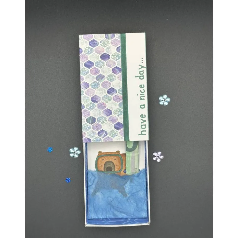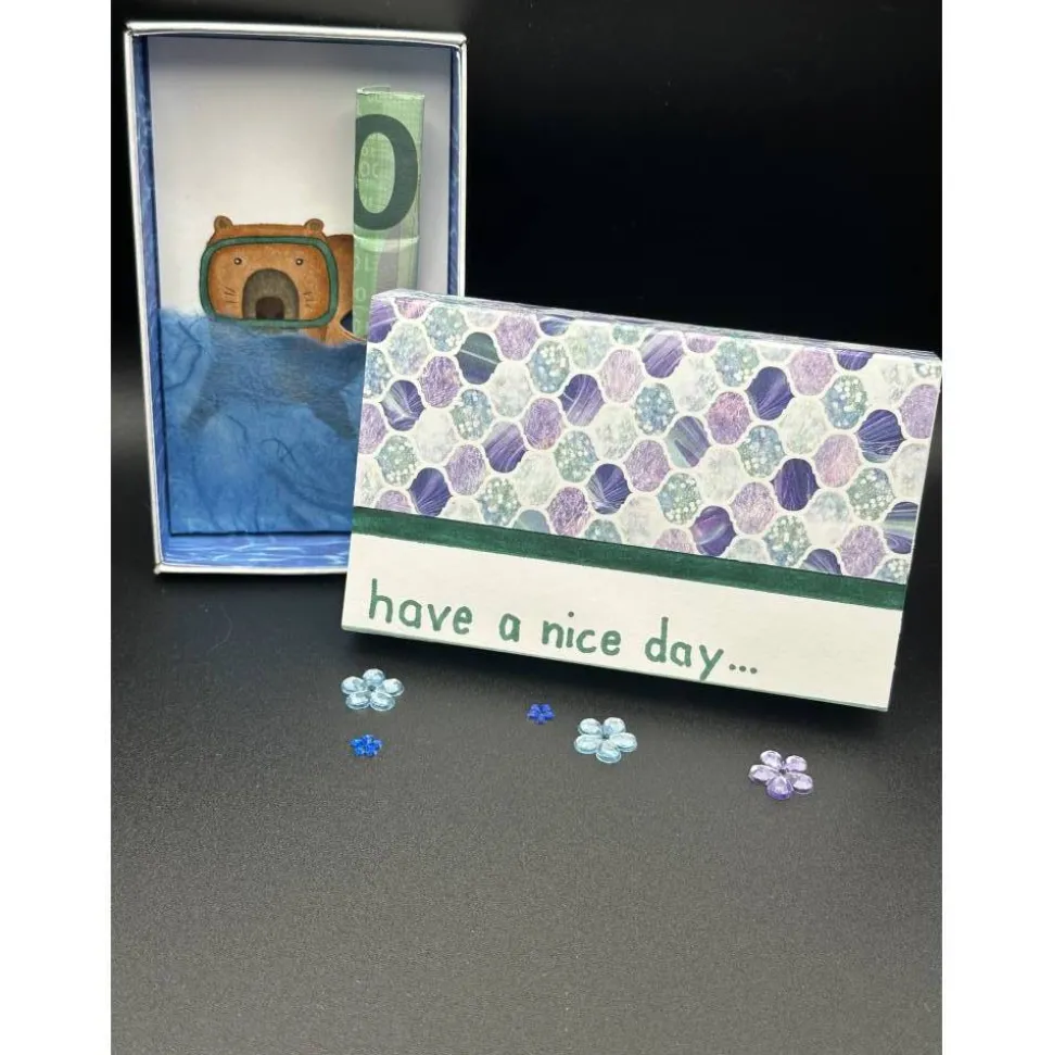 Das Außenteil der Schiebeschachtel ist liebevoll mit Motivpapier beklebt und mit dem Schriftzug „have a nice day“ gestaltet. Die kreative und hochwertige Verarbeitung aus Alkoholmarkern, Strohseidenpapier, Motivpapier und Bastelkleber macht diese Verpackung zu einem echten Unikat.