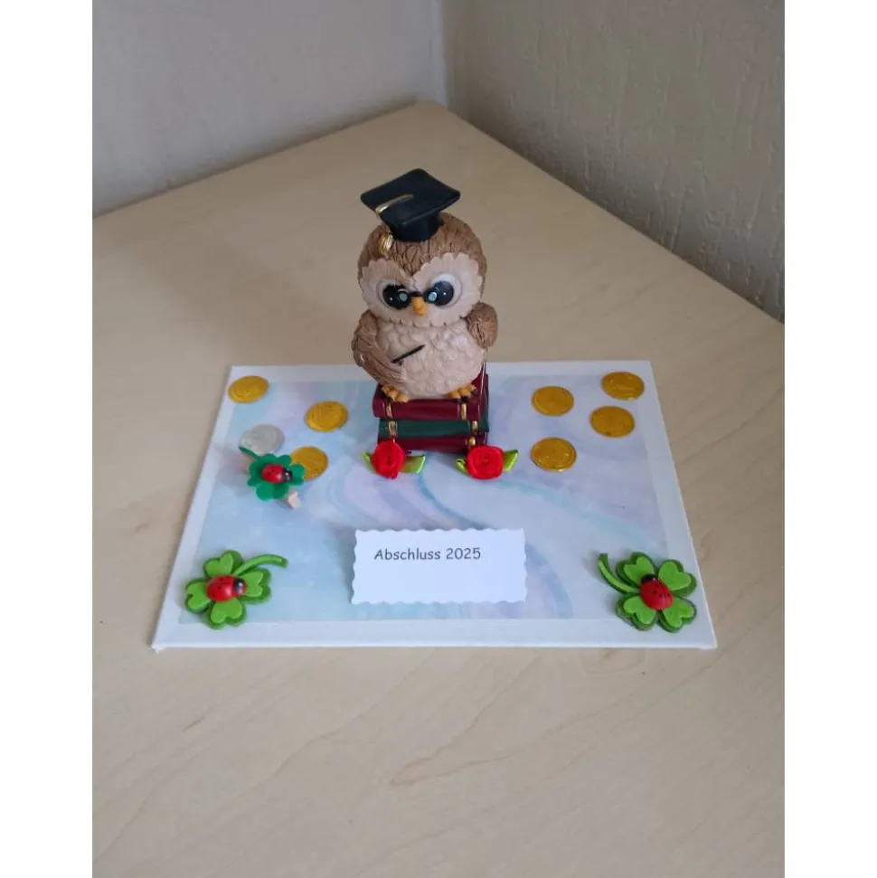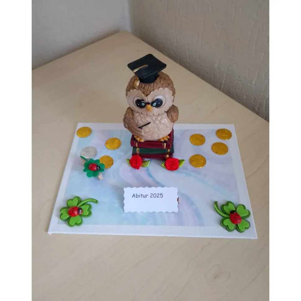 Verschenke ein besonderes Geldgeschenk zum Schulabschluss oder Abitur: Die Eule mit Doktorhut steht als Symbol für Weisheit und Erfolg. Der Malkarton dient als stilvolle Unterlage für die Eule sowie die liebevoll zusammengestellte Deko mit Geldklammer und Glücksklee. Der Geldschein kann einfach an der dekorativen Klammer befestigt werden – perfekt ergänzt durch aufgeklebte „Taler“ als optisches Highlight.