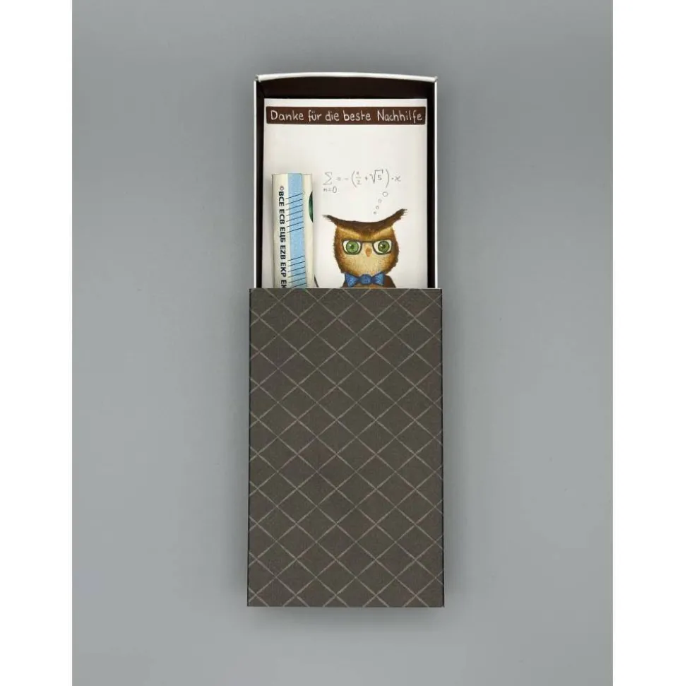 Das detailreiche Eulenmotiv sitzt auf einem Laptop, davor eine braune Schultasche – bereit, neue mathematische Herausforderungen zu meistern. Der braune Aufkleber mit weißer Aufschrift „Danke für die beste Nachhilfe“ macht die Geschenkbox zu etwas ganz Besonderem.