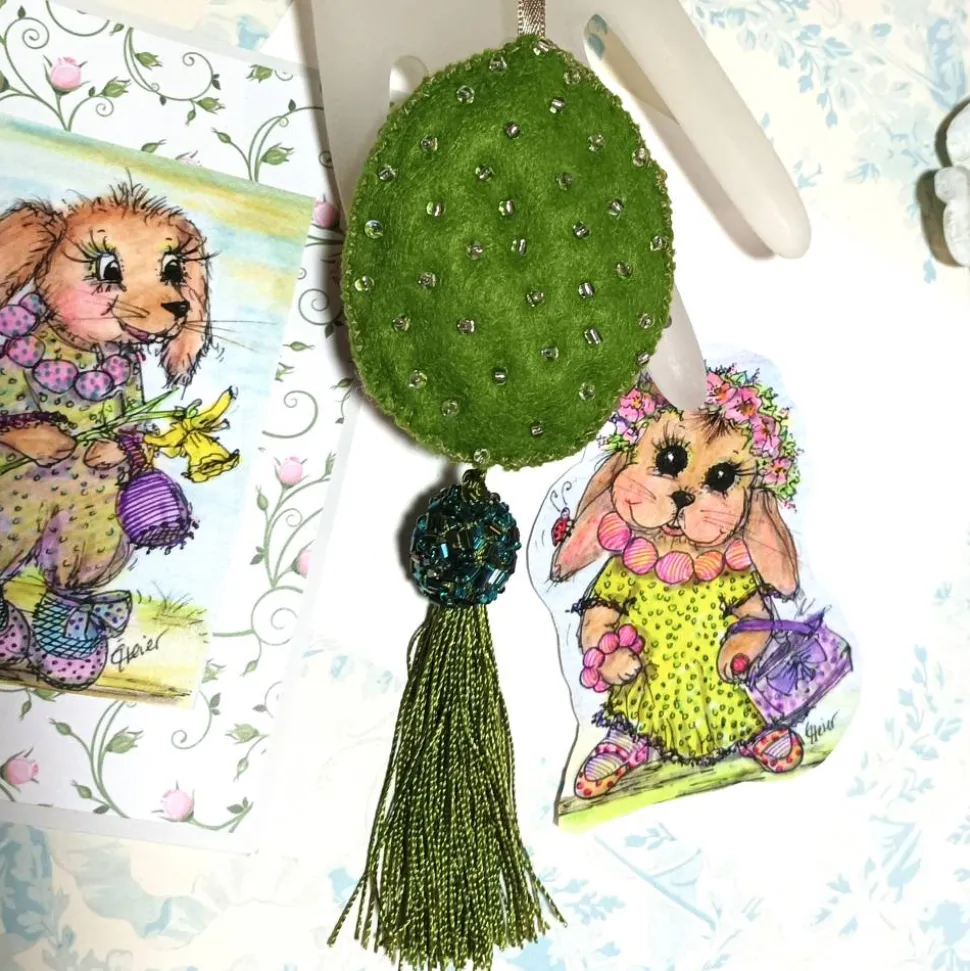 Ornament Anhänger oliv grün lila Unikat Perlenstickerei handgemacht Prunkei pompös handmade Wohndeko