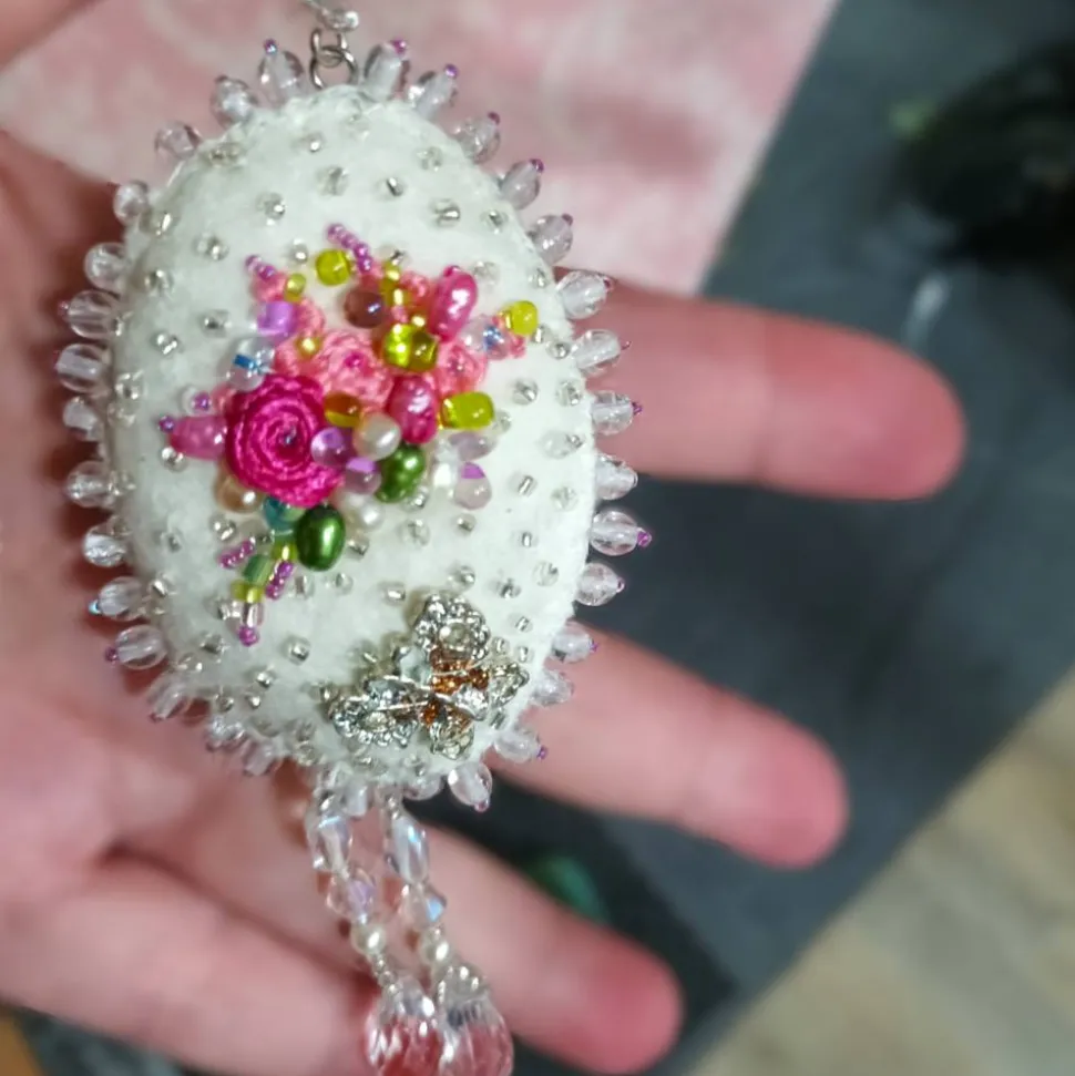 Gestickte Blümchen und ein funkelndes Kristallherz schmücken dieses komplett handgemachte Ornament. Nicht nur zum Landhausstil und shabby chic passende Osterdeko ist dies festlich glitzernde komplett handgemachte und hochwertig handbestickte Ei als Luxusausführung in naturweiß creme. Als Luxus Dekoration mit Perlenblüten in pastell rosa und silberverspiegelten Roccailles verziert funkelt es alas Tischdeko im Blumenstrauss. Komplett von Hand gemacht und in der Opulenz auffälliges sehr aufwändig von mir handbesticktes Osterei mit einer Vielzahl Roccailles verschiedener Art aus Glas gemixt mit Akzenten aus schmmernden Barockperlen und Biwaperlen in Nuancen von altweiß werden in dieser Luxus Wohndeko harmonisch in Szene gesetzt.. Das Ei kann am Kettchen auffgehängt werden. Jedes prunkvolle Osterei ist ein Unikat, ein von mir mit Liebe gefertigtes Einzelstück. Besonders schön lassen sich einzelne handbestickte persönliche Buchstaben und Zahlen zum Osterei im Strauss kombinieren. Es sieht toll und sehr wertig aus auch als Fensterdeko.Du bekommst genau dieses eine abgebildete Osterei in creme weiß rosa mit der funkelnden Quaste.