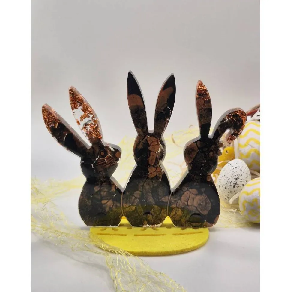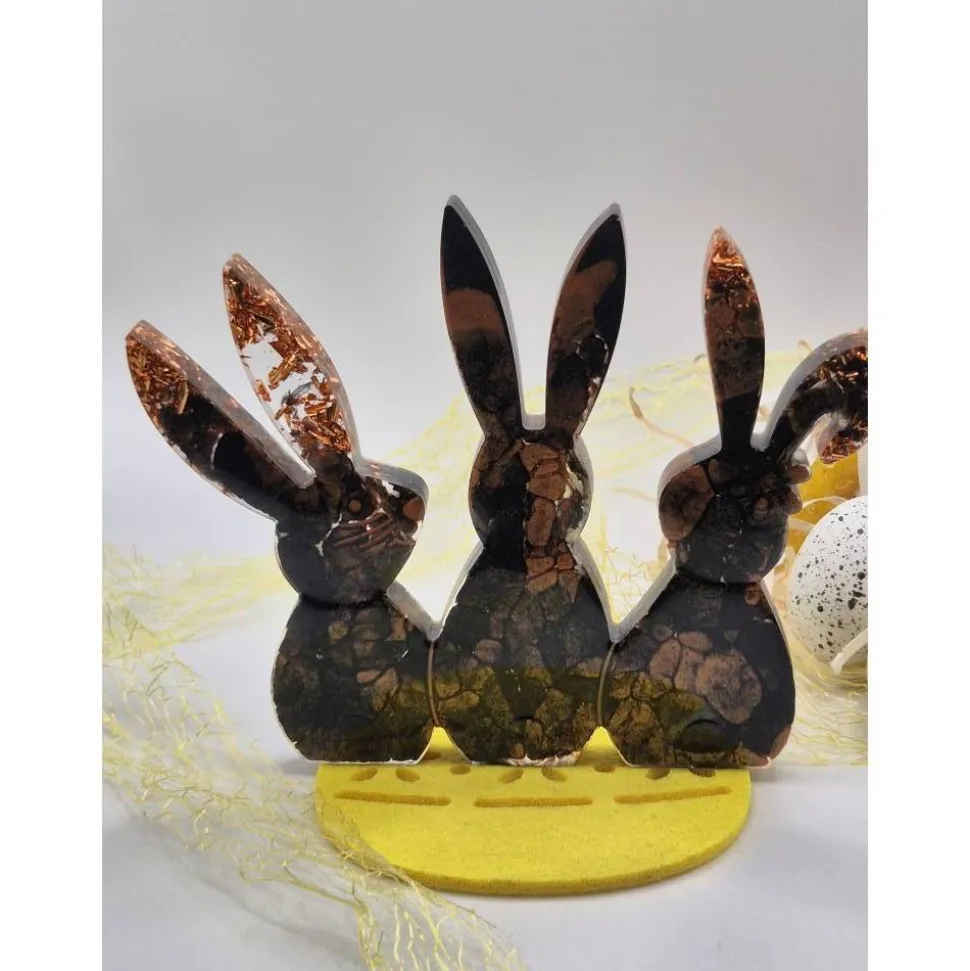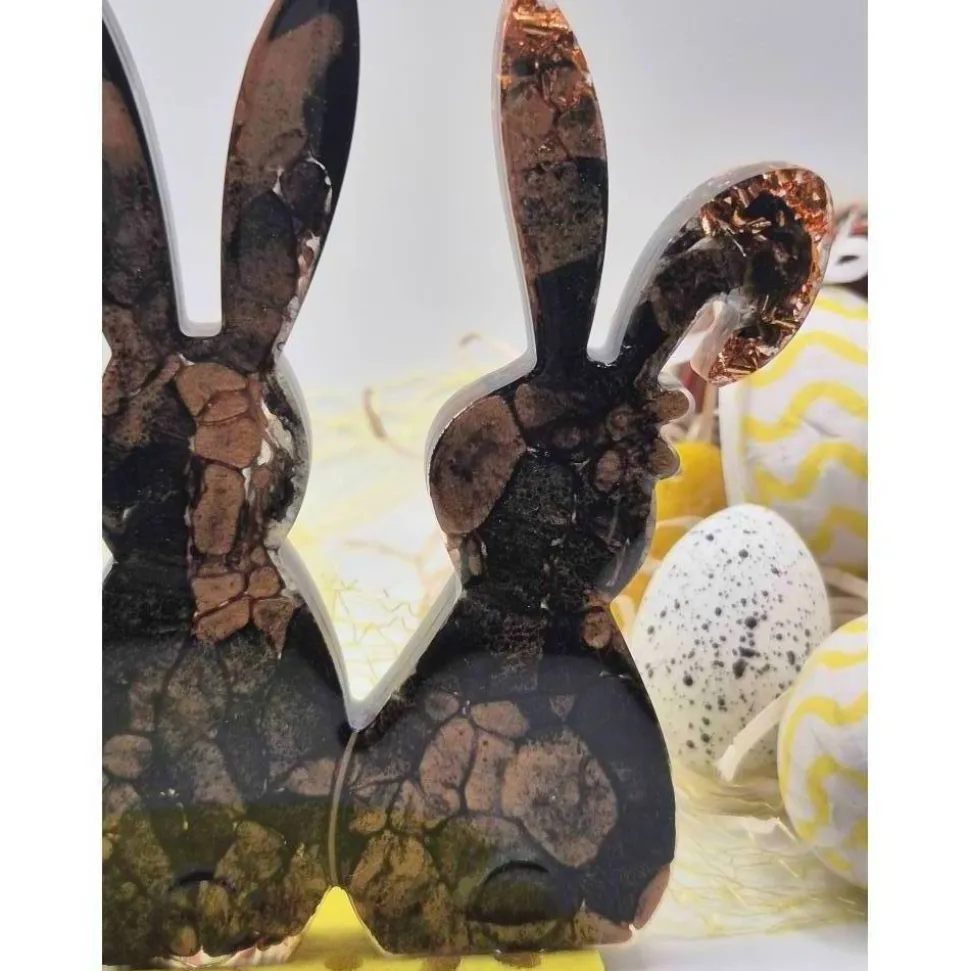 Diese edlen Hasen sind ein echter Blickfang für deine Oster- und Frühlingsdeko. In liebevoller Handarbeit aus Epoxidharz gefertigt, vereinen sie tiefes Schwarz mit warm schimmernden Kupferakzenten und Blattmetall. Jedes Stück ist ein Unikat – die Muster und Effekte entstehen zufällig und machen jeden Hasen einzigartig.