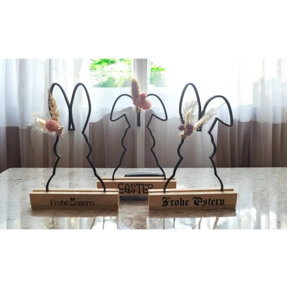 Entdecke wunderschöne Oster-Aufsteller mit Hasenmotiv und Trockenblumen, die deine Frühlingsdeko perfekt ergänzen! Du erhältst den Hase wahlweise ohne Holzständer für 7 Euro oder mit Holzständer und Wunschtext für 12 Euro.