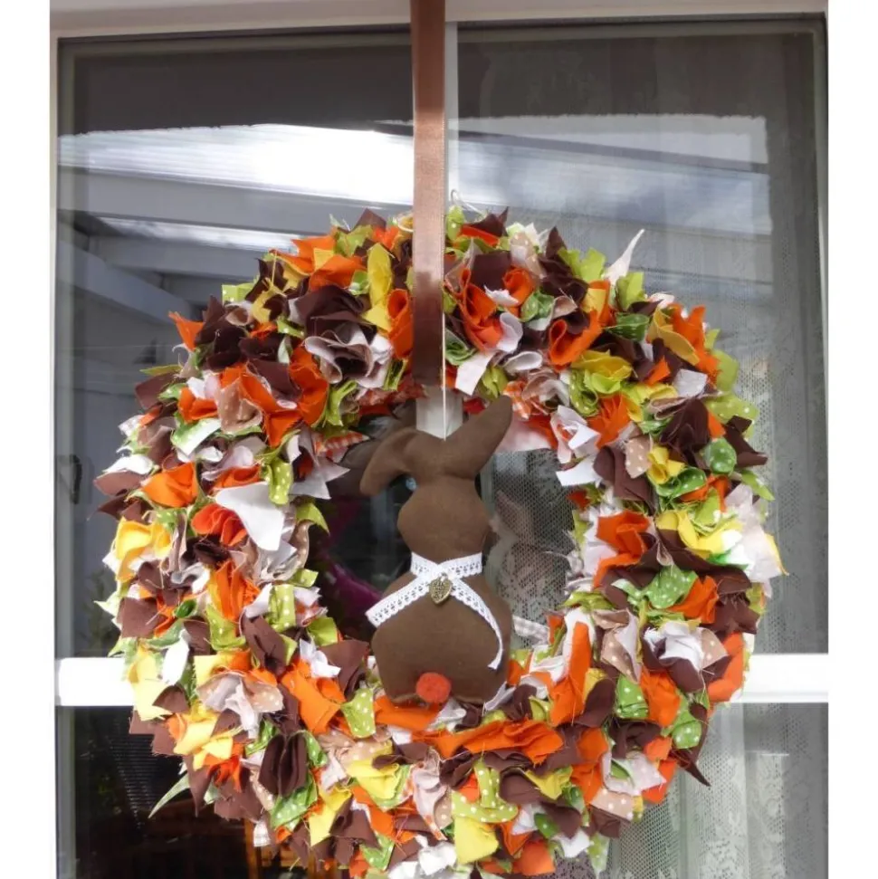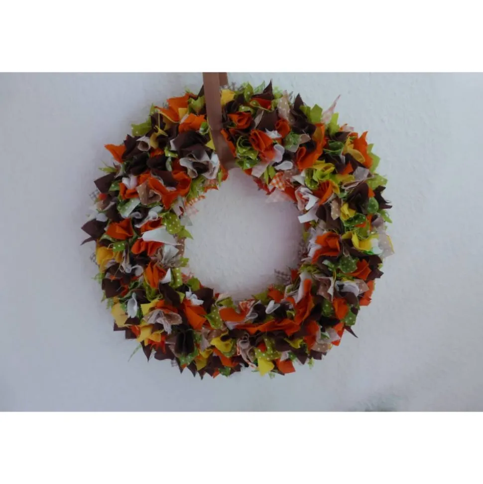 Fröhliche Farben wie Gelb, Grün, Orange, Hellbraun und Schoko lassen diesen Stoffkranz erstrahlen.