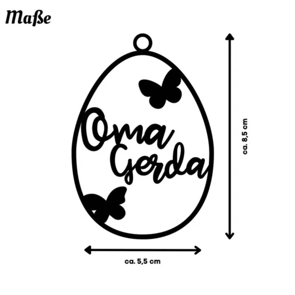 Die Länge des Namens beeinflusst die Schriftgröße: längere Namen werden automatisch etwas kleiner gesetzt, damit es im Ei stimmig bleibt.