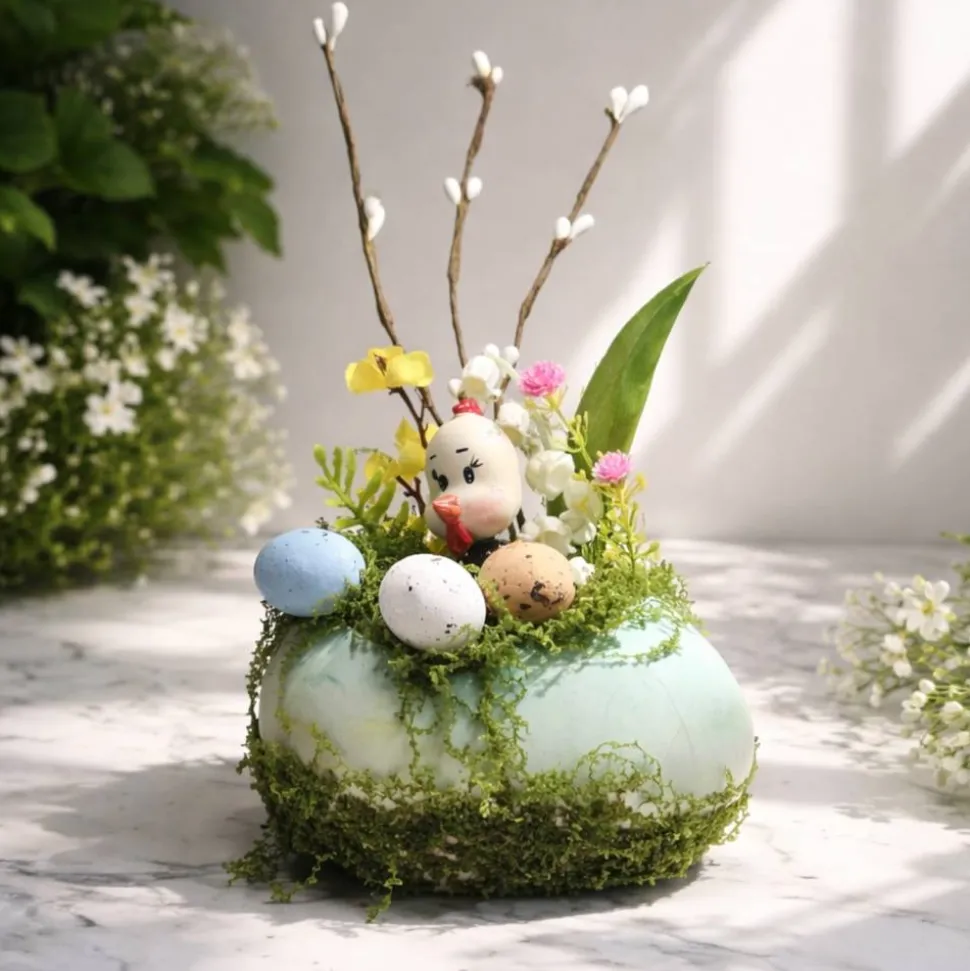 Geschmückt wurde sie mit schönen Kunstblumen, Ostereier und einem Osterküken der aus einer Eierschale, aus dem Gras auf die Welt schaut.