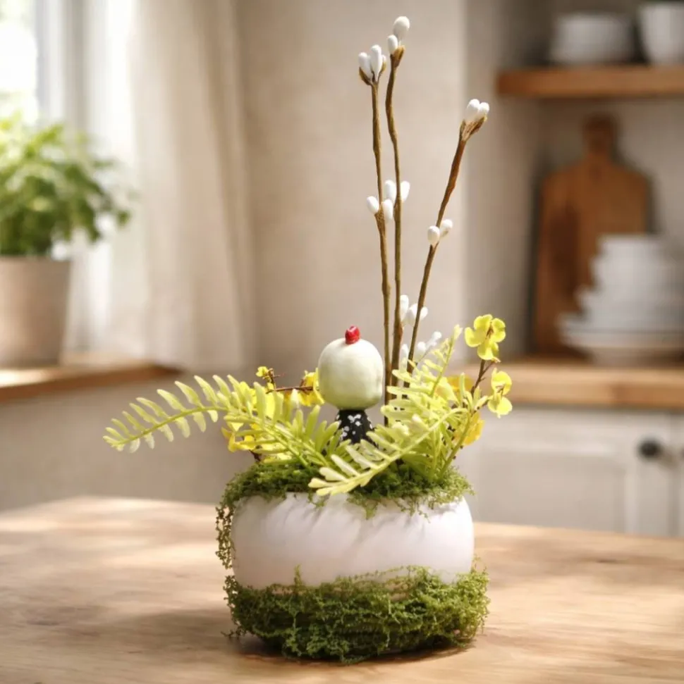 Geschmückt wurde sie mit schönen Kunstblumen, Ostereier und einem Osterküken der aus einer Eierschale, aus dem Gras auf die Welt schaut.