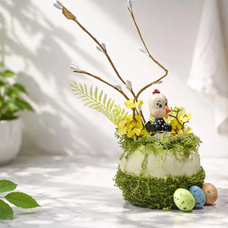 Geschmückt wurde sie mit schönen Kunstblumen, Ostereier und einem Osterküken der aus einer Eierschale, aus dem Gras auf die Welt schaut.