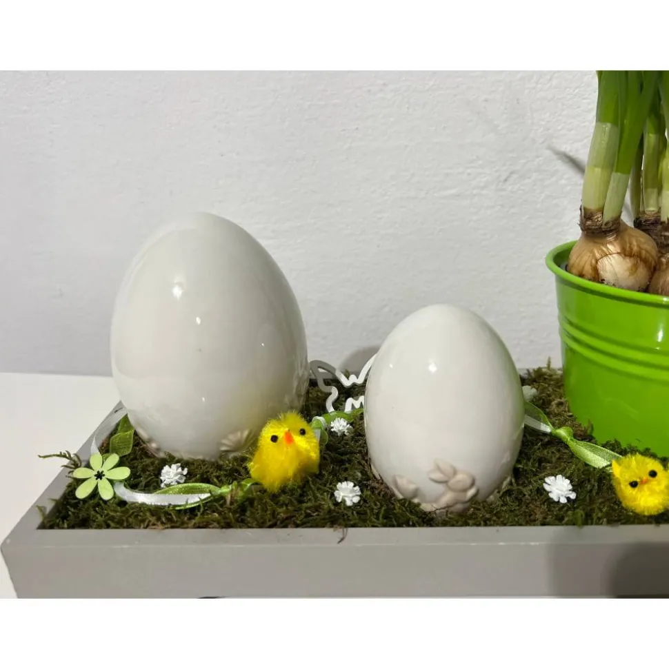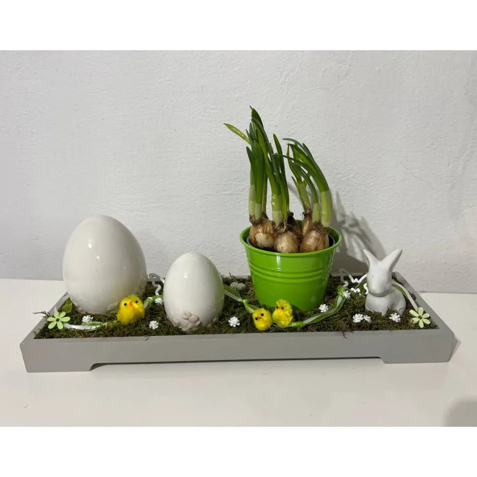 Hier biete ich ein schönes Ostergesteck auf einem Tablett mit einem Blumentopf und Häschen und Eiern an, dass ich mit sehr viel Liebe zum Detail hergestellt habe 🙂