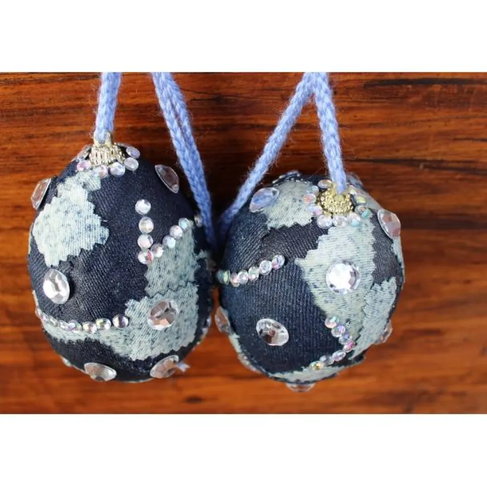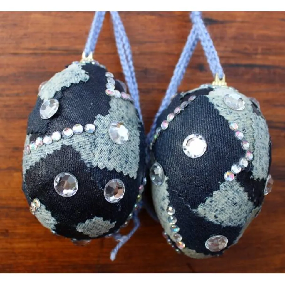 Mit Jeansstoff umkleidete Styroporeier, verziert mit Glitzersteinen.