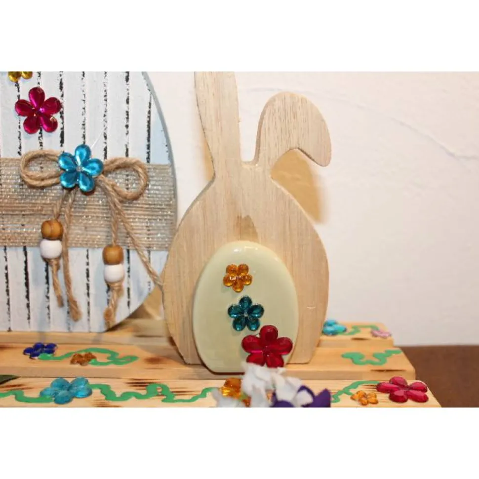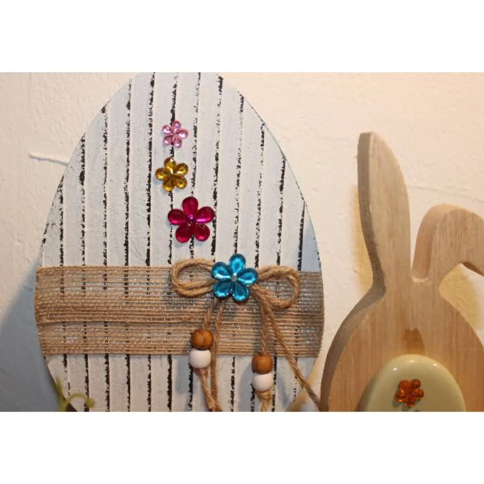 Maße: Palette: ca. 24 x 16 cm, Ei: ca. 17 x 14 x 2 cm, Hase: ca. 15 x 7 x 2 cm (jeweils an der dicksten/höchsten Stelle gemessen)