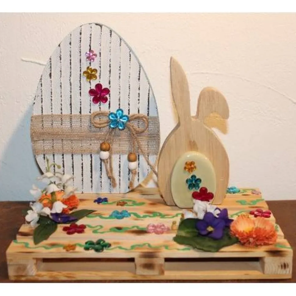 Kleine, geflammte Holzpalette, Osterei und Osterhase mit Acrylfarben bemalt und mit künstlichen Blüten und Sisal beklebt.