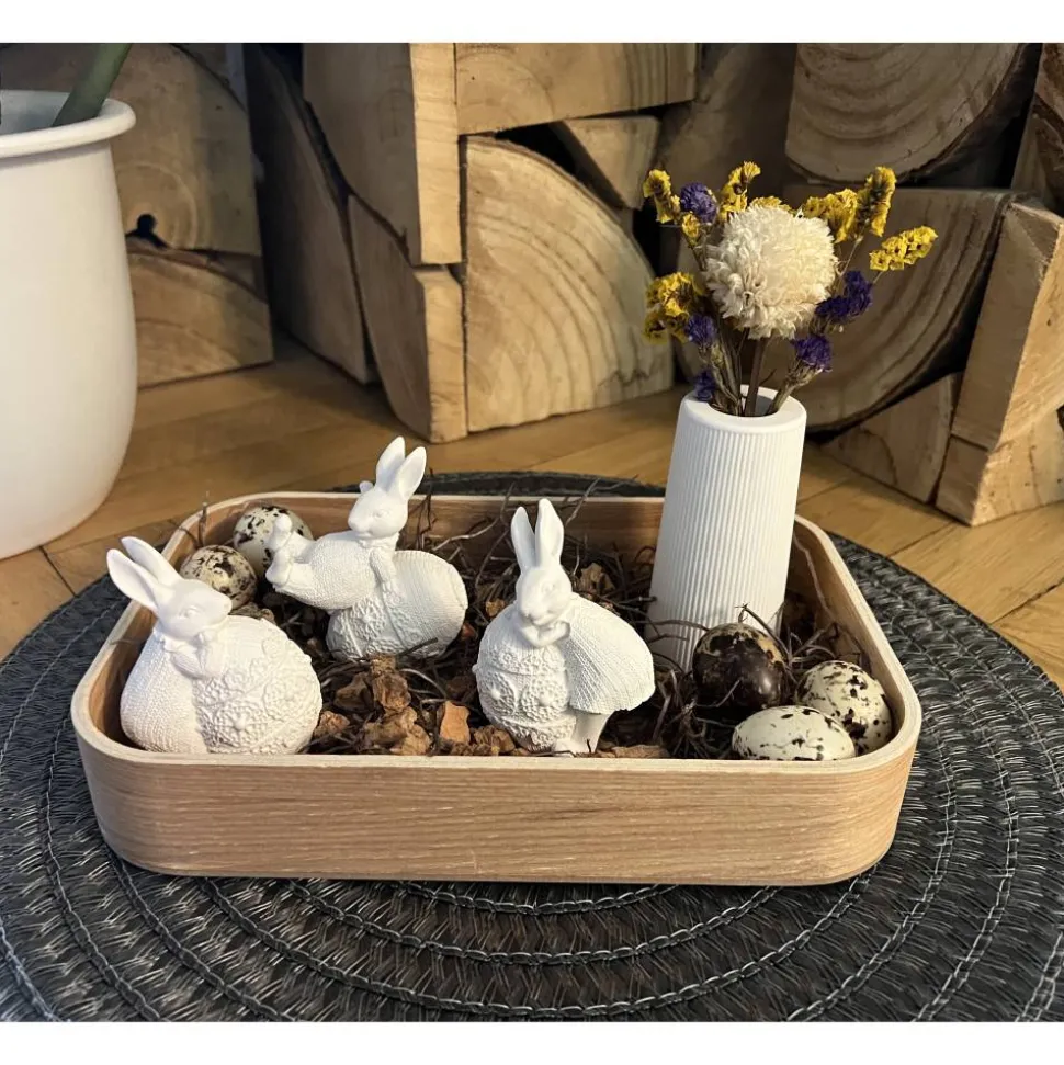 Die hochwertigen Raysin-Hasen-Figuren und der Blumenhalter zeichnen sich durch ihre detailreiche Gestaltung aus und werden Sie mit ihrem charmanten Charme sicherlich begeistern. Ideal für alle, die eine festliche und gleichzeitig moderne Atmosphäre lieben.