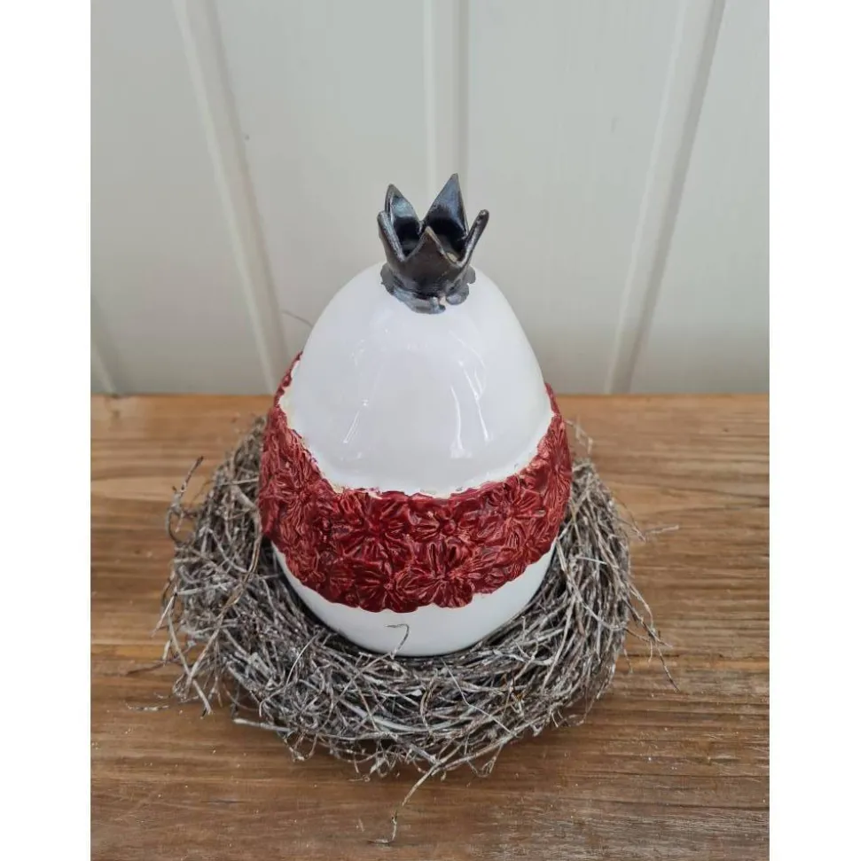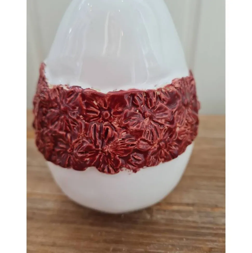 Das Ei wurde weiß und Kirschrot glasiert und bei 1050 Grad gebrannt.