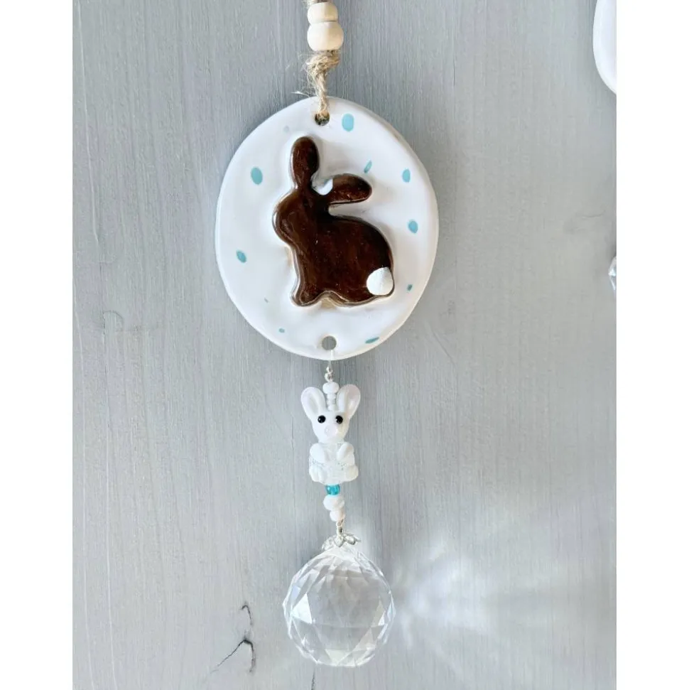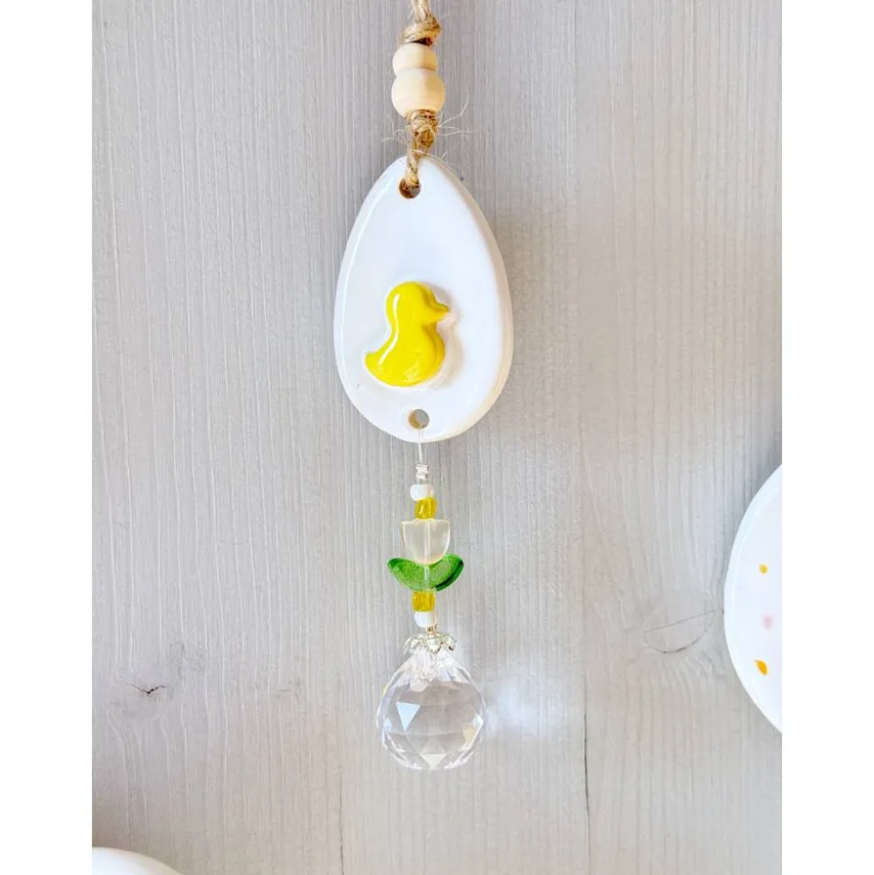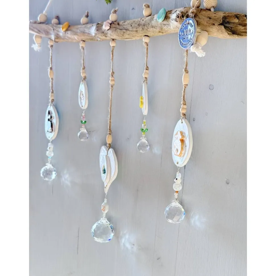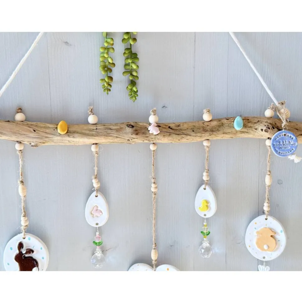 Ich kann es kaum erwarten, dir meinen selbstgemachten Deko Treibholzast vorzustellen! Ich habe ihn mit fünf handgefertigten, super süßen österlichen Keramikanhängern geschmückt, die ich selbst designt, hergestellt und gebrannt habe. Jeder Anhänger ist mit frühlingshaften Perlen und funkelnden Sonnenfänger-Kristallen verziert – einfach zauberhaft!