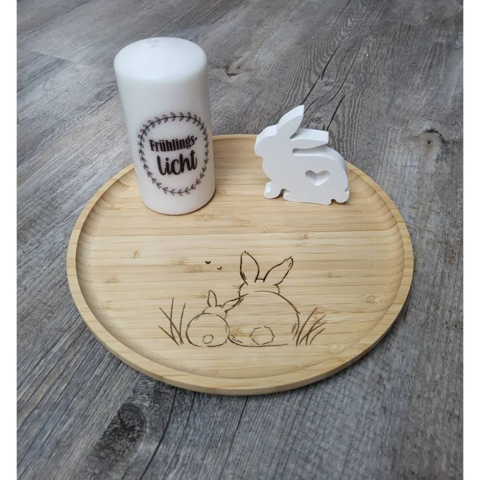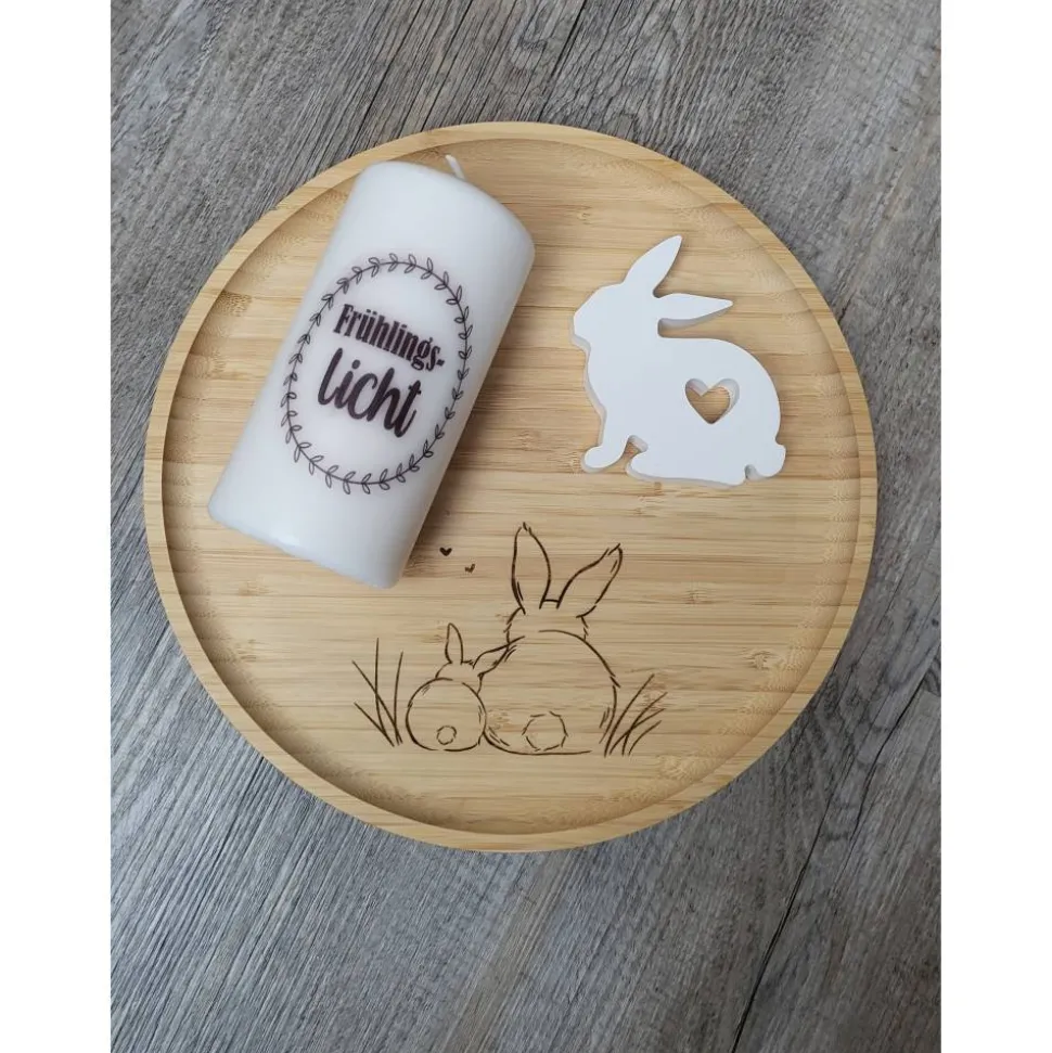 Diese Deko besteht aus einem gravierten Bambusteller, einer beschrifteten Stumpenkerze und einem gegossenem Osterhäschen.
