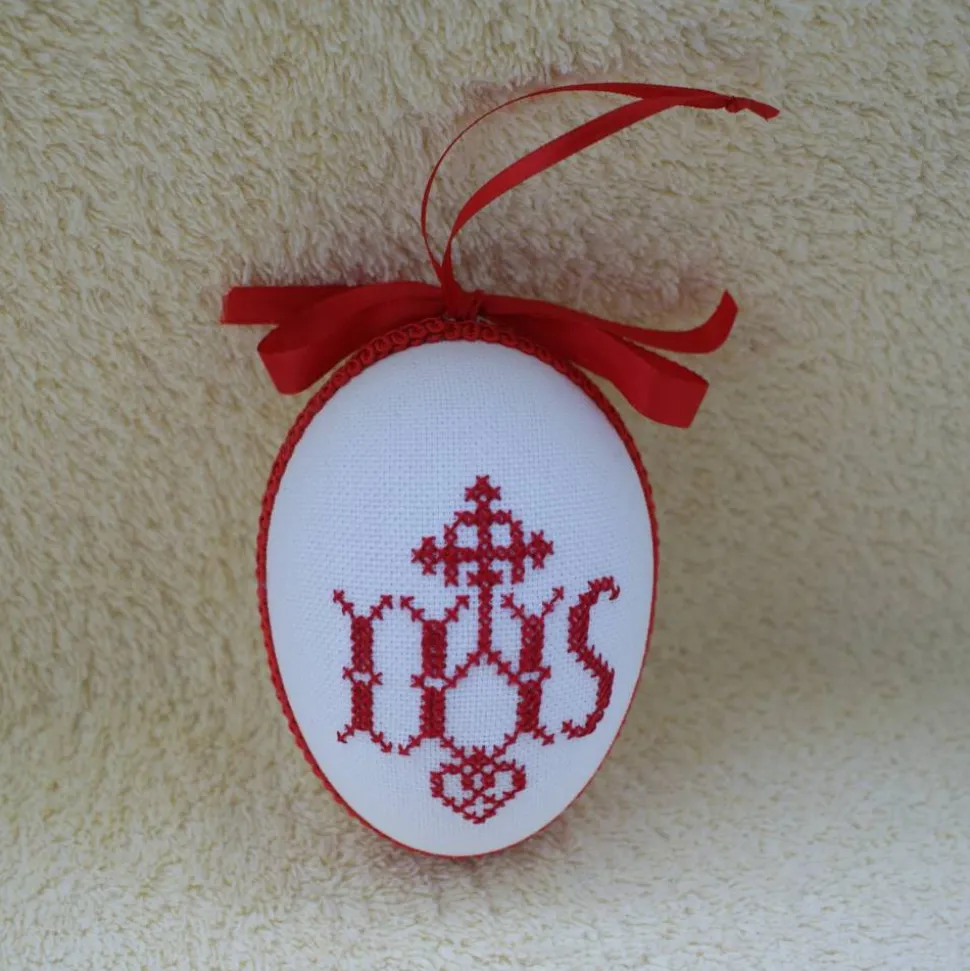 Osterdeko, Kreuzstich Osterei Handarbeit gestickt  religiöses Motiv   12cm, rot weiß,