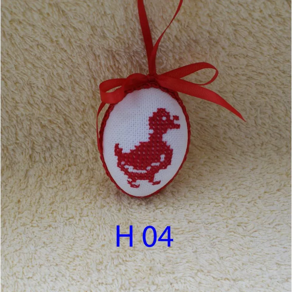 Das Ei ist beidseitig mit verschiedenen Motiven, in Kreuzstich, bestickt und mit Schleife und Schlingenborte verziert.