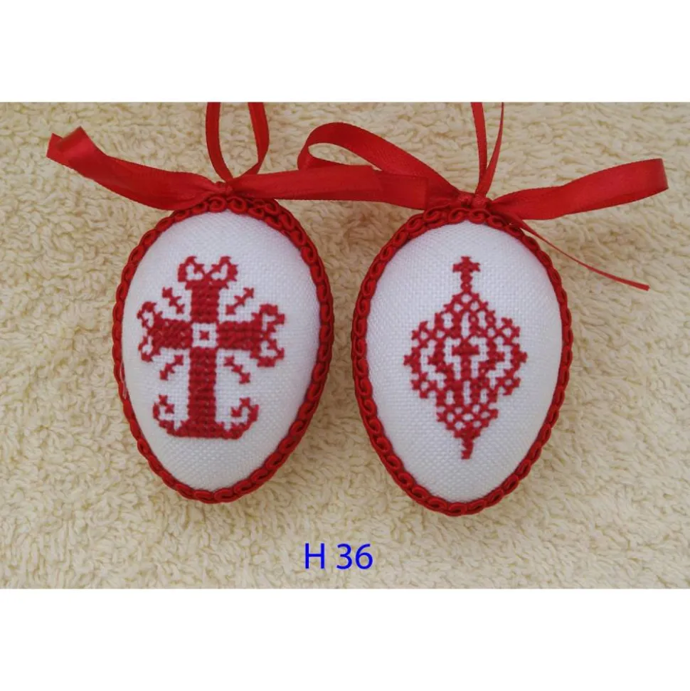 Das Ei ist beidseitig mit verschiedenen Motiven, in Kreuzstich, bestickt und mit Schleife und Schlingenborte verziert.