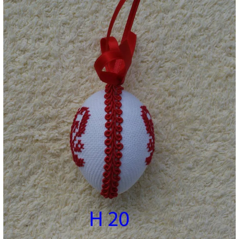 Das Ei ist beidseitig mit gleichen Motiven, in Kreuzstich, bestickt und mit Schleife und Schlingenborte verziert.