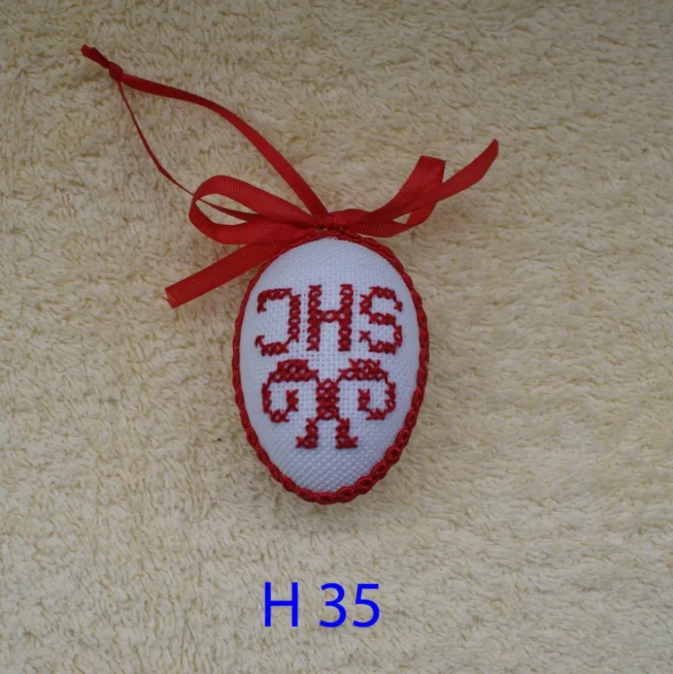 Das Ei ist beidseitig mit gleichen Motiven, in Kreuzstich, bestickt und mit Schleife und Schlingenborte verziert.