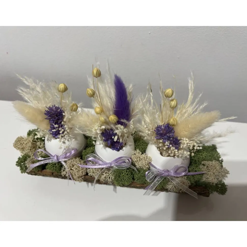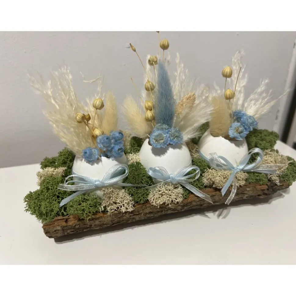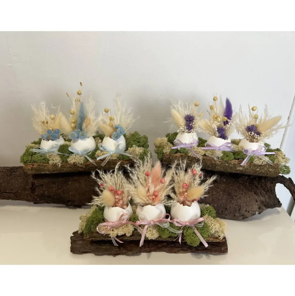 Hier biete ich verschiedene schöne Ostergestecke mit echten Eier und Trockenblumen auf einer Baumrinde an, die ich mit sehr viel Liebe zum Detail selbst hergestellt habe 🙂